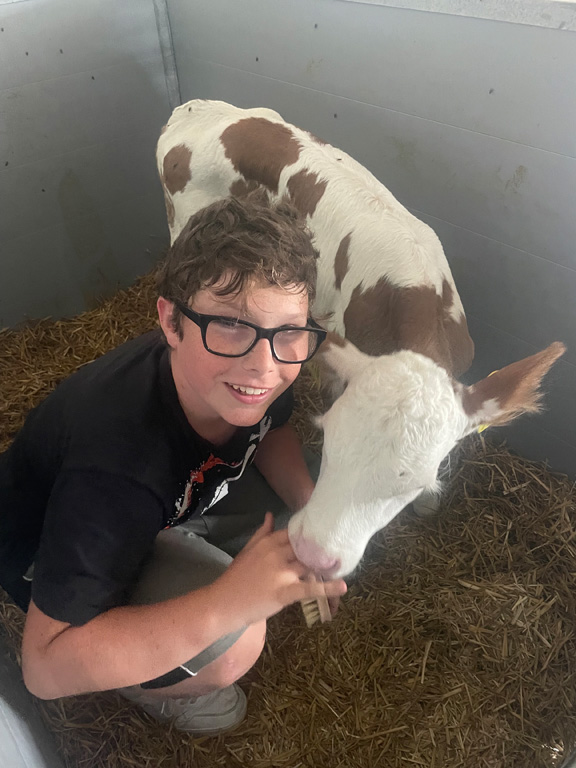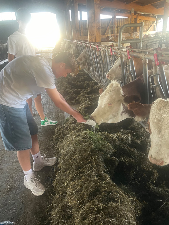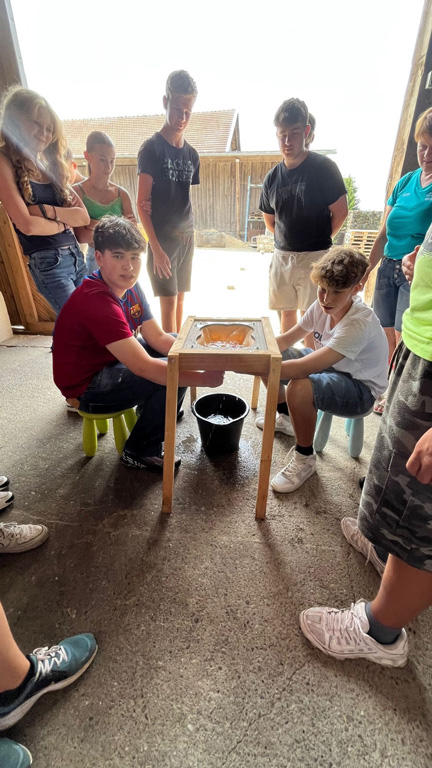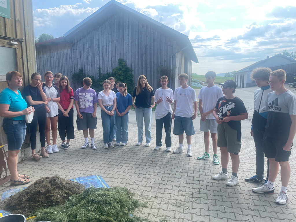 Zur Mitte der Woche stand der Besuch des Erlebnisbauernhof der Familie Reischl in Wegscheid an, der perfekt die zuvor bearbeiteten Erkenntnisse zur Ernährung und regionalen Erzeugern vereinte. Die Familie Reischl informierte die Schülerinnen und Schüler mithilfe einer Hofbesichtigung und Flurbegehung über das Arbeiten eines Landwirtes. Dabei wurde mit den Schülern über die Erzeugung von Lebensmitteln und grüner Energie diskutiert. Außerdem stellten die Landwirte dar, wie sie unsere heimische Kulturlandschaft pflegen und welchen Beitrag sie zum Klimaschutz leisten. Zudem durften die Schülerinnen und Schüler selbst aktiv werden, indem sie Futter mischten, beim Melken der Kühe helfen oder Butter schüttelten.