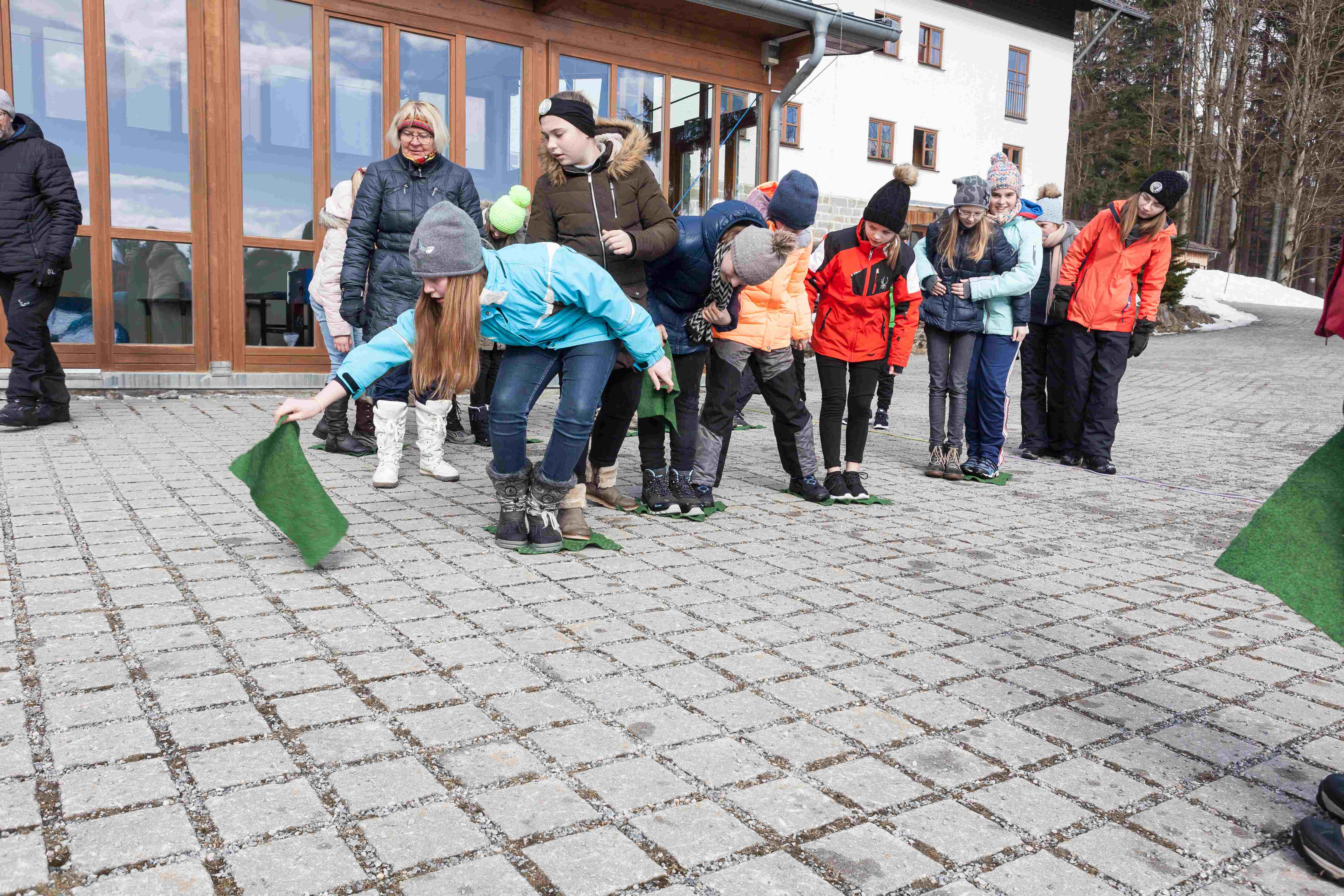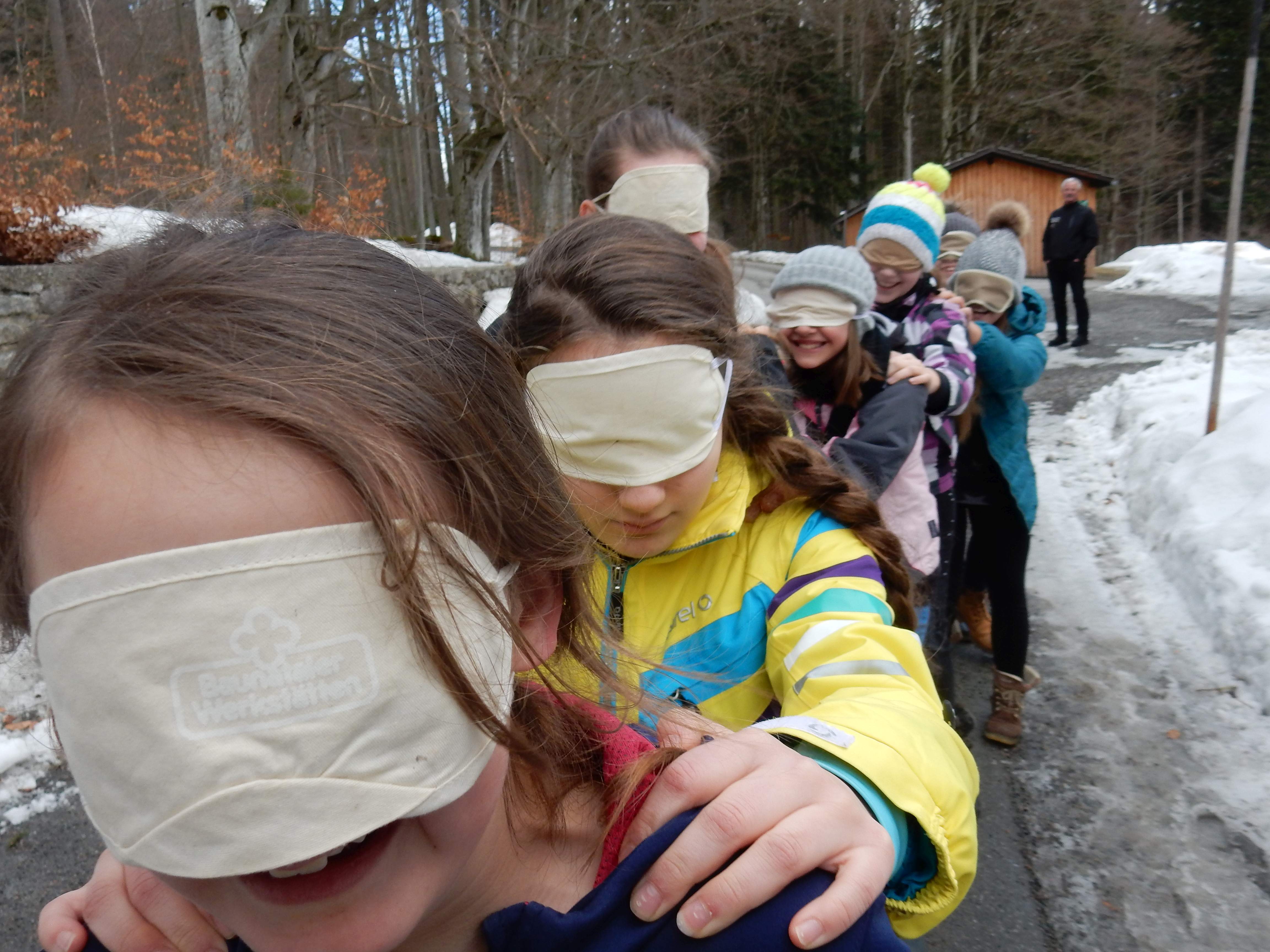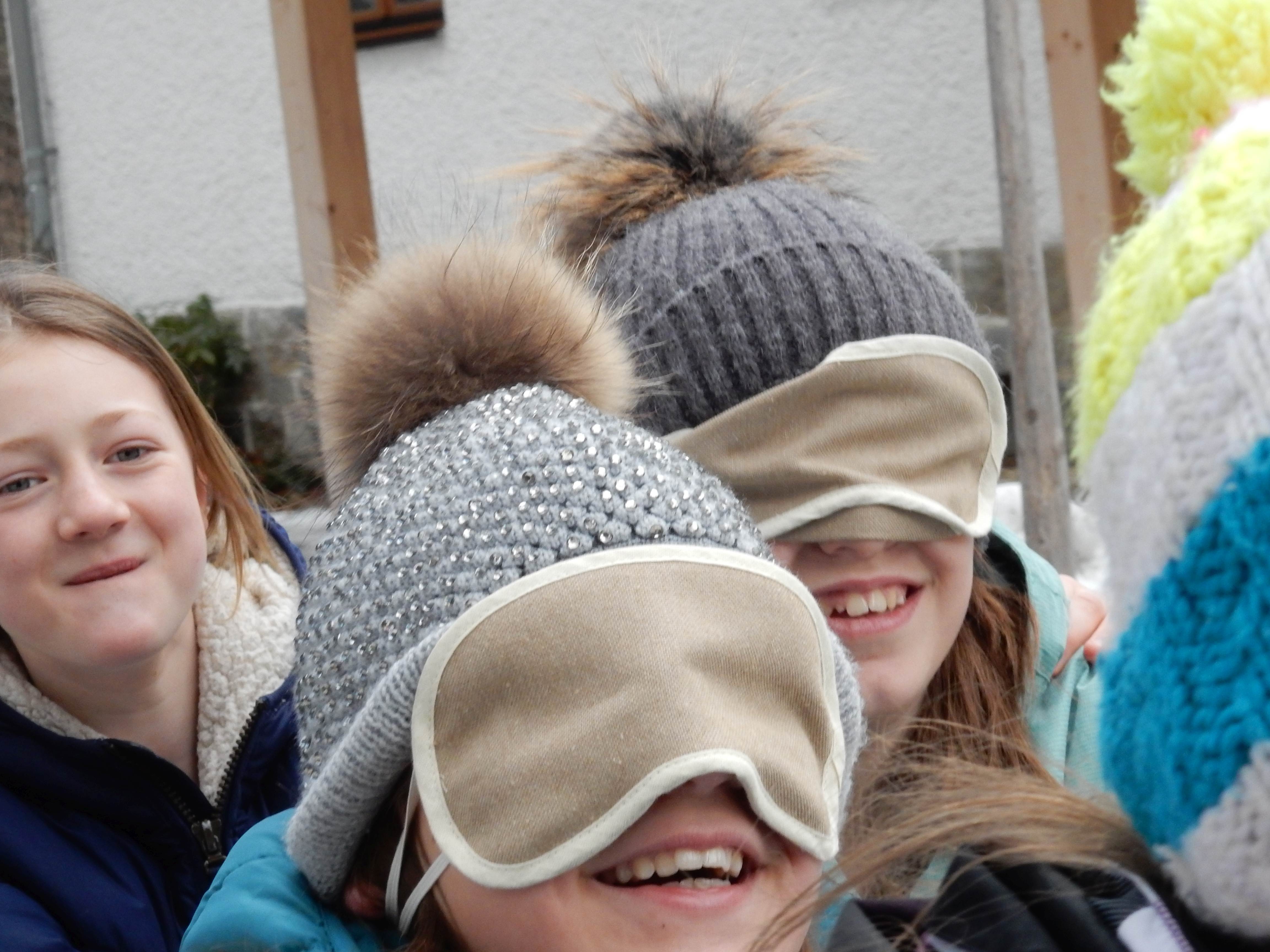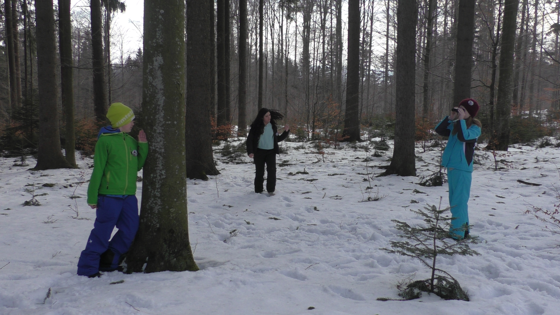 Heute war unser Tag in zwei Abschnitte geteilt. Am Vormittag erlebten wir spannende Spiele im Wald, zum Beispiel ein Versteckspiel, wobei wir unsere Sinne testeten, während der andere Teil der Klasse sich mit Schneeschuhwandern beschäftigte. Am besten war das Spiel mit dem reißenden Fluss. Man musste mit grünen Filzflecken über einen reißenden Fluss kommen. Dabei durften wir die Filzflecken nicht loslassen, sonst verschwindet der Filzflecken im reißenden Fluss.
