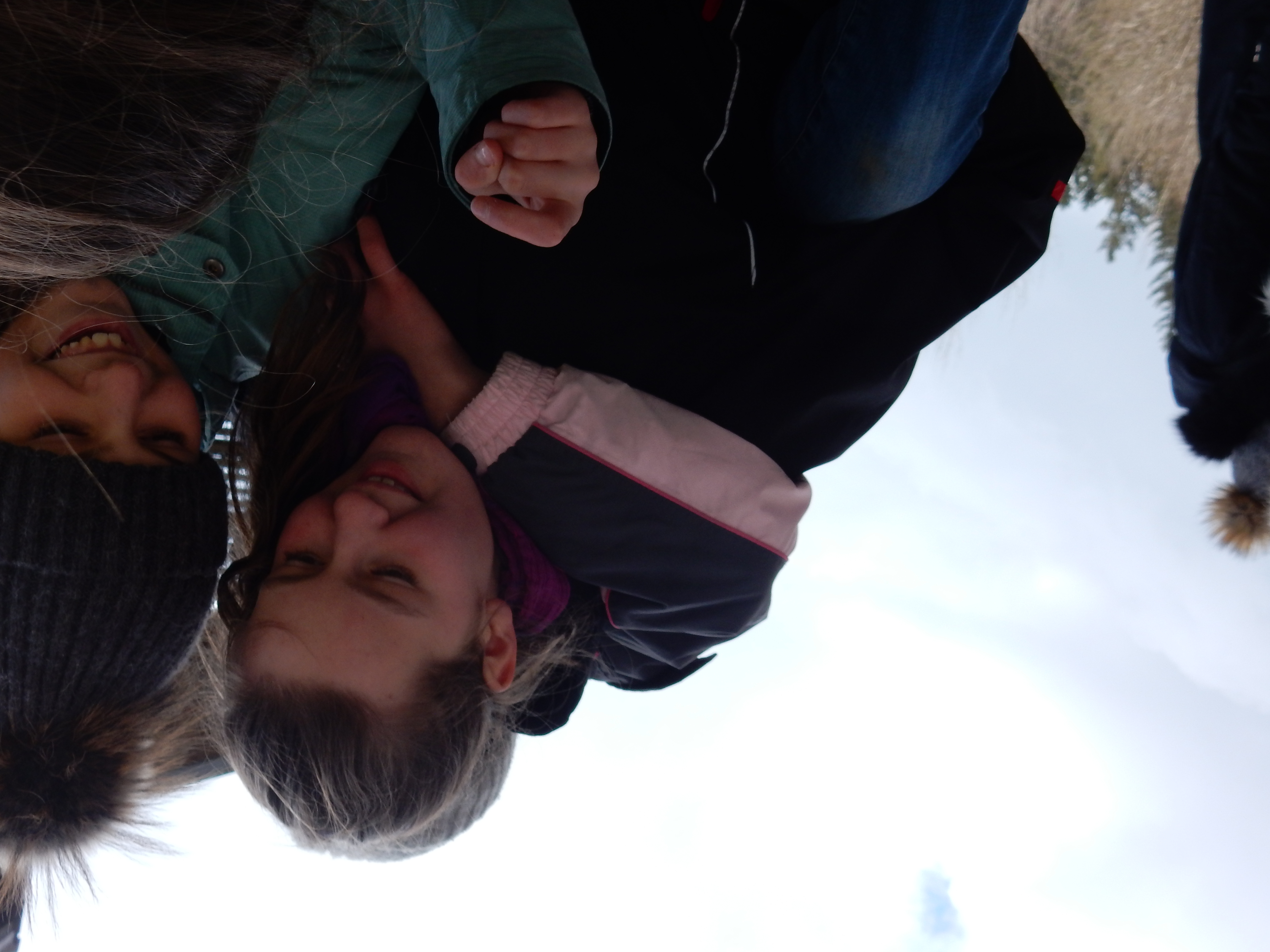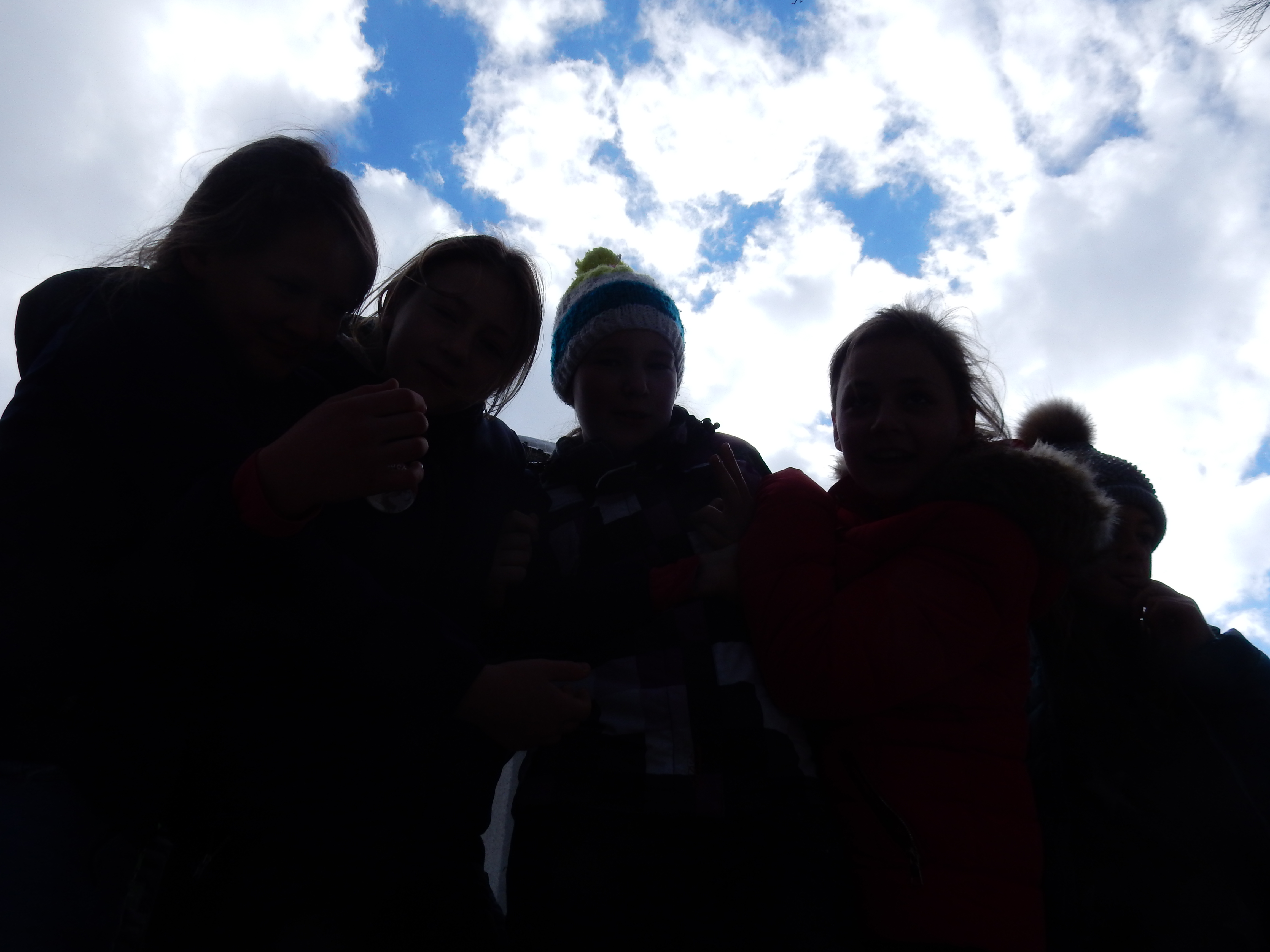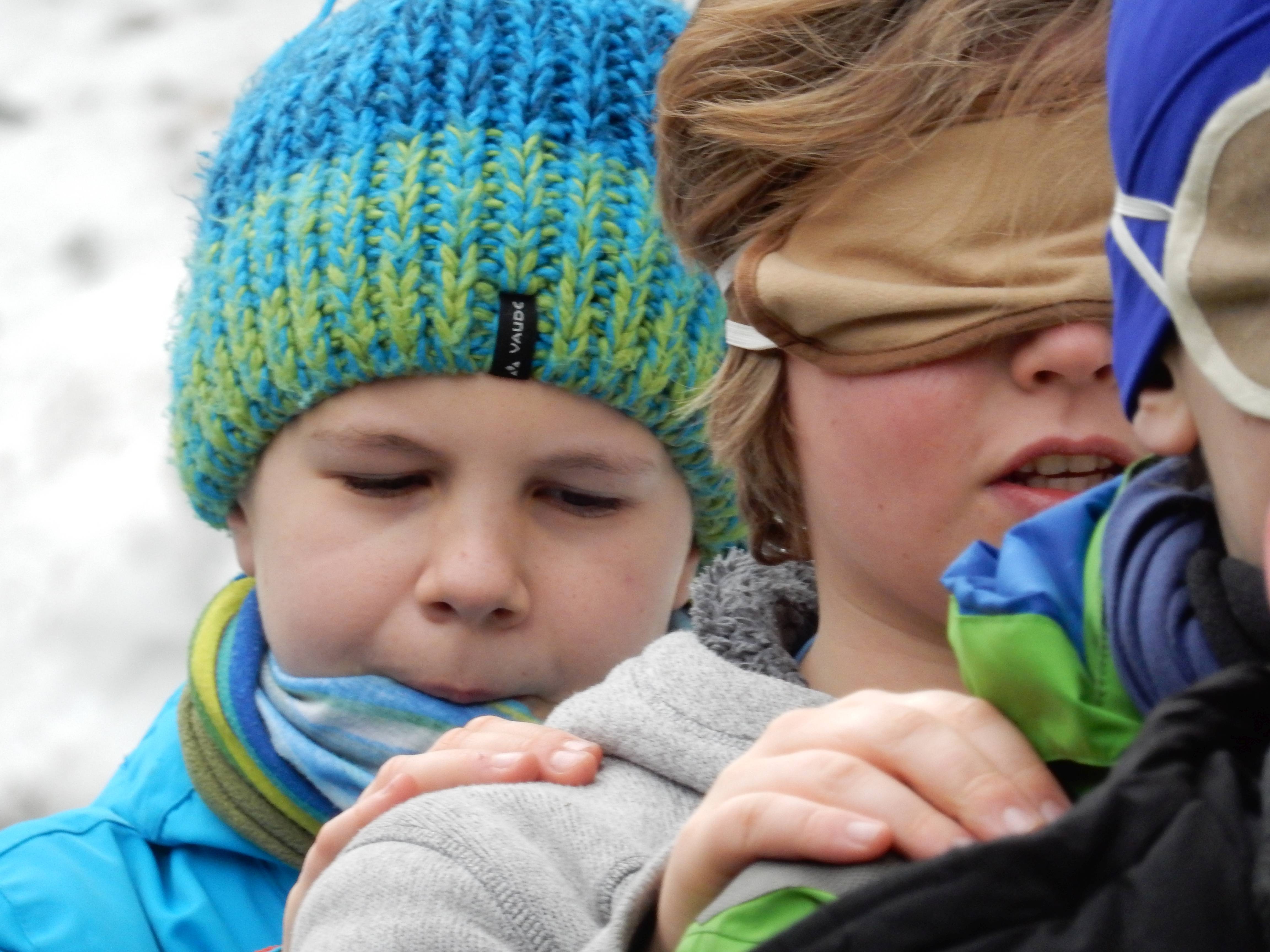 Heute war unser Tag in zwei Abschnitte geteilt. Am Vormittag erlebten wir spannende Spiele im Wald, zum Beispiel ein Versteckspiel, wobei wir unsere Sinne testeten, während der andere Teil der Klasse sich mit Schneeschuhwandern beschäftigte. Am besten war das Spiel mit dem reißenden Fluss. Man musste mit grünen Filzflecken über einen reißenden Fluss kommen. Dabei durften wir die Filzflecken nicht loslassen, sonst verschwindet der Filzflecken im reißenden Fluss.