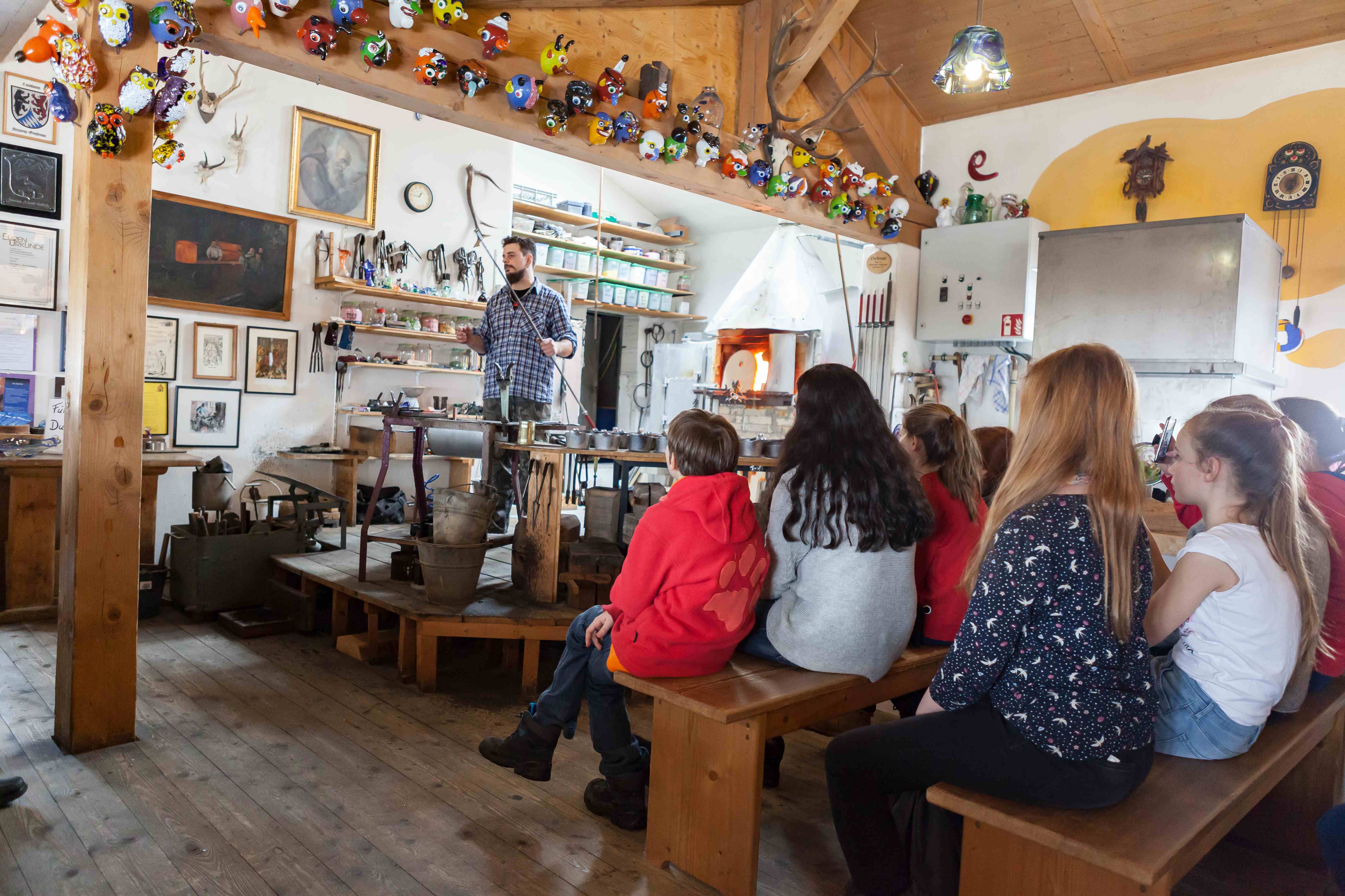 Auf dem Programm stand heute der Besuch in einem Museum (Waldmuseum St. Oswald) und beim Glasbläser. An der Ausstellung fand ich besonders gut, dass es da besondere Räume und Geheimverstecke gab. In versteckten Höhlen konnte man Geschichten hören. In den Geschichten ging es um alte Legenden aus dem Bayerischen Wald. Das Museum war in drei Stockwerke aufgeteilt, es war verwinkelt, aber man kannte sich aus. Wir durften am Ende der Führung das Museum alleine erkunden. Wir konnten alles selber ausprobieren, das hat mir besonders gut gefallen.
