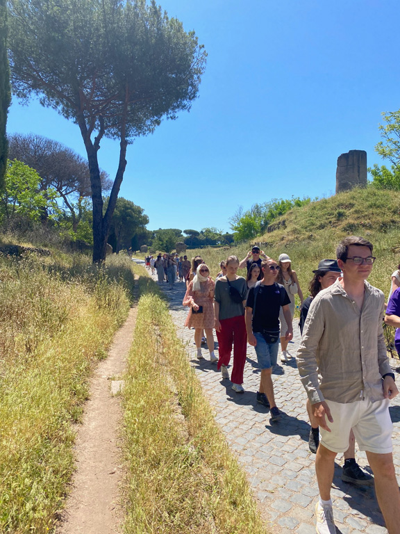 Der Samstag begann mit unserem ersten vollen Tag in Rom. Am Vormittag machten wir uns auf den Weg zur Piazza Venezia, wo das offizielle Kennenlernen der Stadt begann. Das gewaltige Monument für Vittorio Emanuele II., das sich hell und mächtig über den Platz erhebt, war einer der ersten Eindrücke, die uns zeigten, wie imposant und vielschichtig Rom ist. Von dort aus fuhren wir weiter zur Via Appia Antica, einer der ältesten Straßen Roms, die schon vor über zweitausend Jahren genutzt wurde. Gesäumt von Pinien, alten Mauern und verstreuten Grabstätten, wirkte sie wie eine stille Erinnerung an das, was Rom einmal war. Während unseres Spaziergangs auf dem historischen Pflaster konnten wir spüren, wie viel Vergangenheit eigentlich unter unseren Füßen liegt. Im Anschluss kehrten wir in ein Restaurant in der Nähe ein, wo wir gemeinsam zu Mittag aßen. Besonders eindrucksvoll war am Nachmittag der Besuch der Katakomben. Denn, sobald wir die Stufen in die Tiefe betraten, änderte sich die Stimmung. Die Luft wurde kühler, das Licht gedämpfter, die Geräusche verschwanden beinahe. In den schmalen, gewundenen Gängen wurde einem bewusst, wie alt dieser Ort ist und welche bedeutende Rolle er früher spielte. Die Vorstellung, dass hier Menschen ihre Toten bestatteten, dass hier Zuflucht und Glaube nebeneinander existierten, war bewegend. Nach diesem tiefen Eindruck stand ein weiterer Programmpunkt auf dem Plan: der Besuch der Basilika Sankt Paul vor den Mauern. Schon beim ersten Blick auf das riesige Bauwerk wurde klar, dass dies kein gewöhnliches Kirchengebäude war. Die hohe, goldverzierte Decke, die langen Säulengänge und vor allem die Bildergalerie aller bisherigen Päpste machten diesen Ort eindrucksvoll. Das Bild des amtierenden Papstes wird durch ein Licht hervorgehoben, was dem Ganzen etwas Lebendiges verleiht. Auch wenn die Kirche weit vom Trubel des Zentrums entfernt liegt, beeindruckt sie durch ihre Größe und Klarheit. Schließlich kehrten wir wieder ins Hotel zurück.