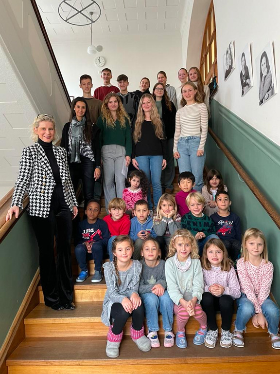 Ende November 2023 besuchte das P-Seminar Leseförderung des Auersperg-Gymnasiums Freudenhain auf Einladung der Schulleiterin Andrea Silberhorn von der Mittelschule St. Nikola die erste Klasse der Altstadtschule. Die 11 Schüler*innen durften sich eine Deutschstunde anschauen, bei der die Klassenleiterin Angelika Wildenauer den Erstklässlern den Buchstaben “D” vorstellte. Nach einer kurzen Begrüßung konnten die Seminarteilnehmer*innen zuerst den Unterricht verfolgen, dann im Lauf der Stunde aber auch selbst den Kindern helfen und mit ihnen Aufgaben bearbeiten. Im Anschluss bedankten sich die Schüler*innen mit selbstgemachten Muffins bei der ersten Klasse und es fand eine Gesprächsrunde mit Frau Wildenauer und der Schulleiterin, Frau Silberhorn, statt.