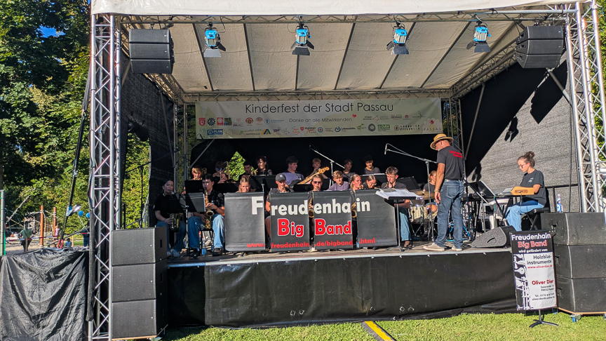 Das Kinderfest der Stadt Passau am 21.09.2025 war für alle ein Fest. Viele junge und „alte“ Gäste kamen und genossen das vielfältige Programm im wunderschönen Ambiente des Bschüttparks. Die Sonne schien den ganzen Tag auf die fröhliche Festwiese. Wem das noch nicht genug war, der ließ sich zum Ende des Programms von der „FreudenhainBigBand“ ordentlich einheizen. Die jungen Musiker vom Freudenhain, die auf der sonnenbeschienenen Bühne selbst ordentlich schwitzten, zeigten sich zu Beginn der Saison in bemerkenswerter Form.