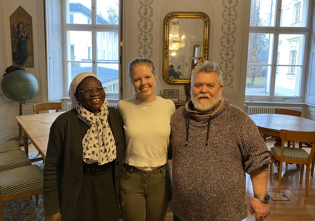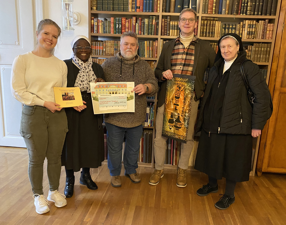 Einer der Höhepunkte des Tages war sicher der Besuch von Schwester Mercy Shumbamhini CJ aus Simbabwe, die in Begleitung von Schwester Gracia CJ aus Pasing an die Schule kam, beide Mitglieder der Congregatio Jesu, so wie der Maria-Ward-Orden heute heißt. Zustande gekommen war der Kontakt durch Religionslehrerin Eva-Maria Eichinger, die 2018 Sister Mercy Shumbamhini CJ im Maria Ward Kinderheim in Amaveni (Simbabwe) kennengelernt hat. Schwester Mercy freute sich sehr über einen Spendenscheck über 500 Euro, den sie gerne für ihre Maria-Ward-Schulen, Krankenstationen und das Kinderheim in Simbabwe entgegennahm.