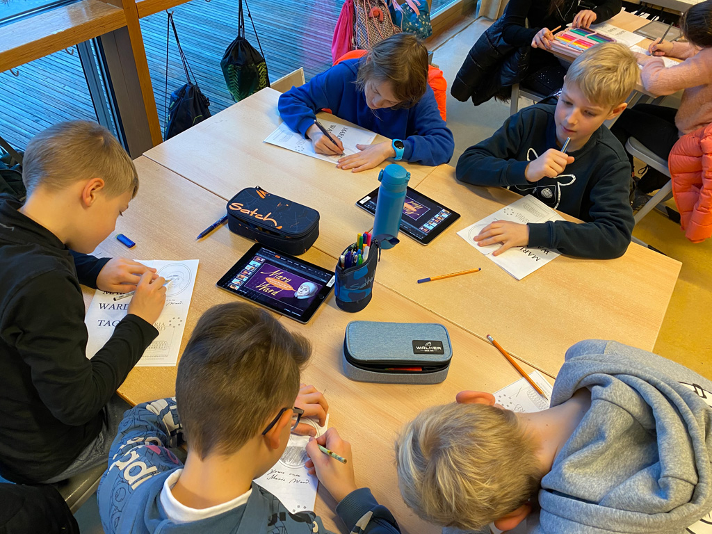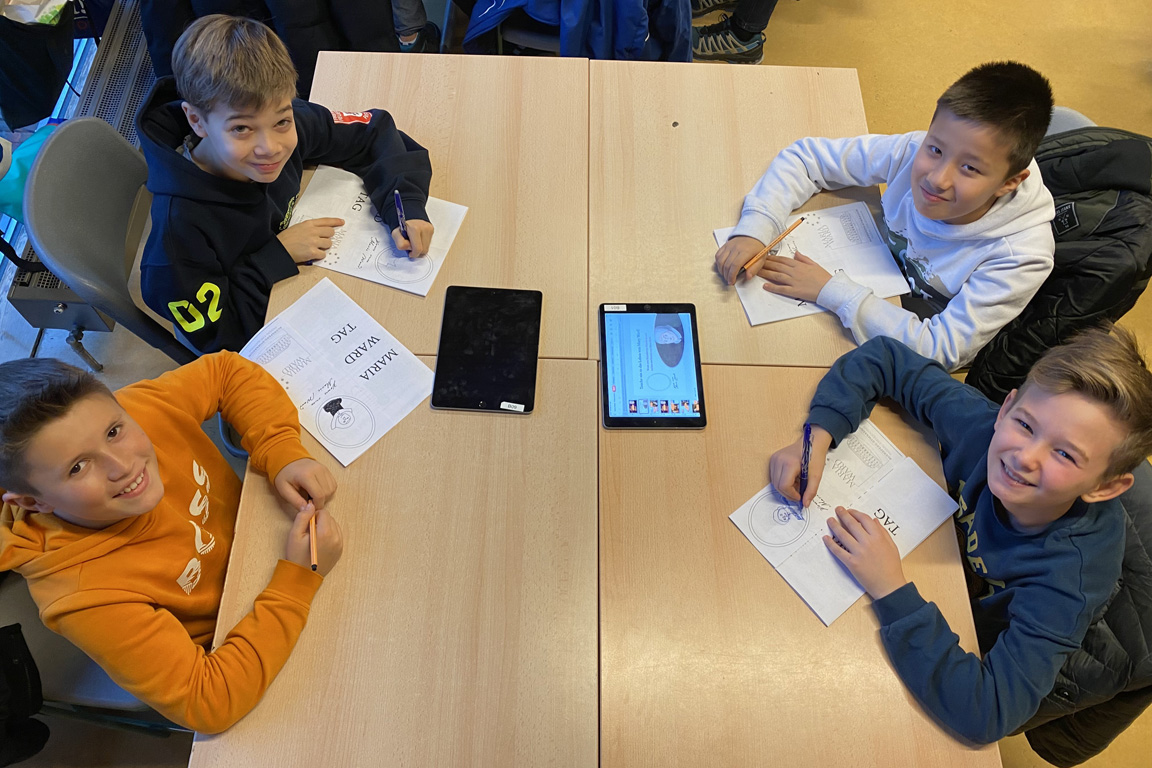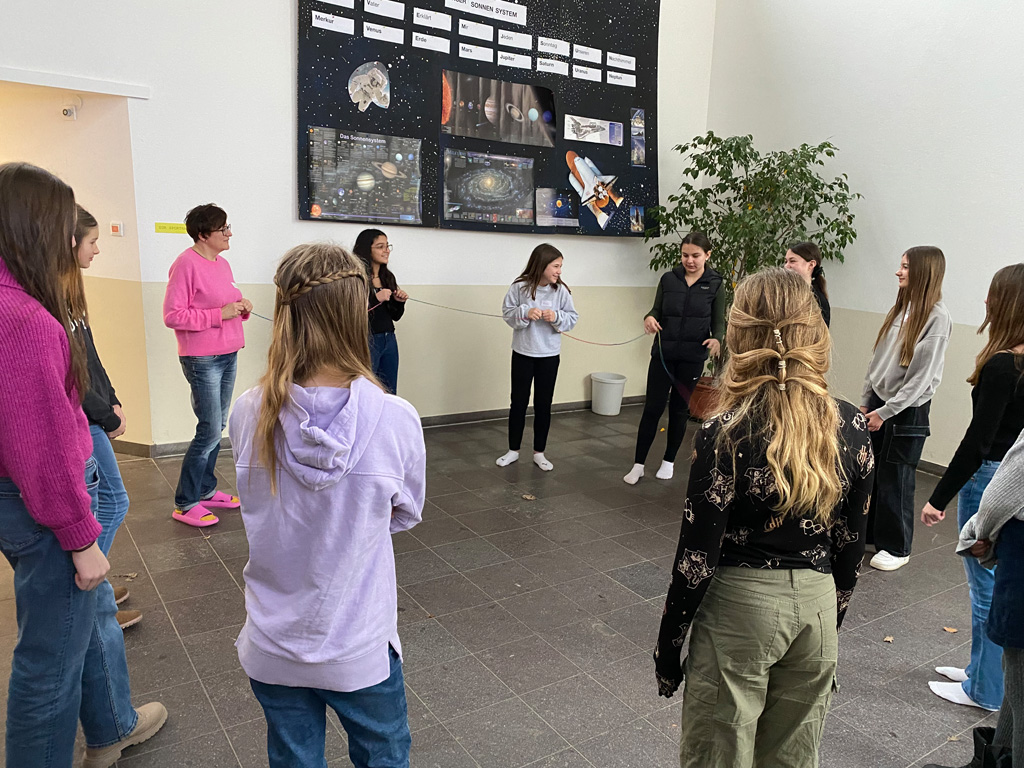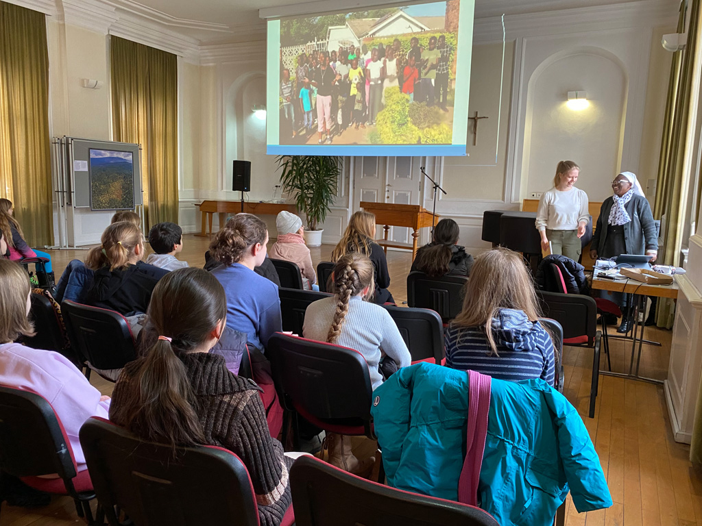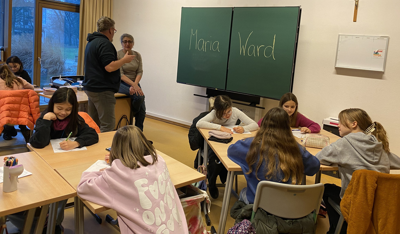 Natürlich ließ sie es auch nicht nehmen, den fünften Klassen Bilder aus ihrer Heimat zu zeigen und zu erzählen, was sie mit den Spendengeldern finanzieren wird. Damit erhielten diese einen konkreten Einblick in das Wirken Maria Wards. Im Klassenverband lernten sie an diesem Tag auch die Biographie der Ordensgründerin spielerisch und gestalterisch kennen.