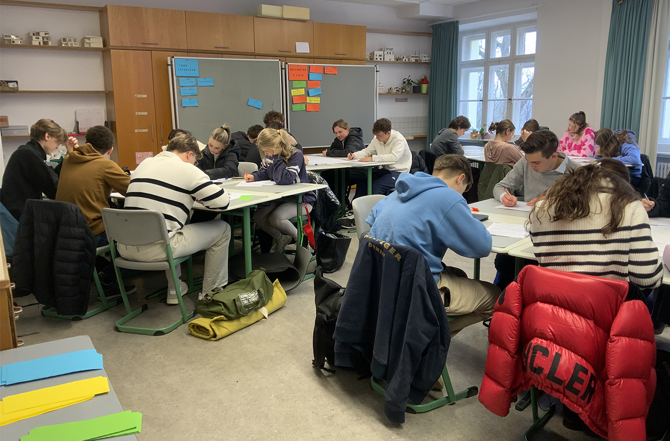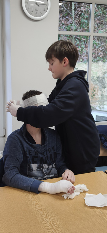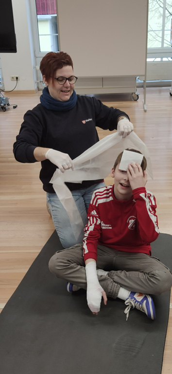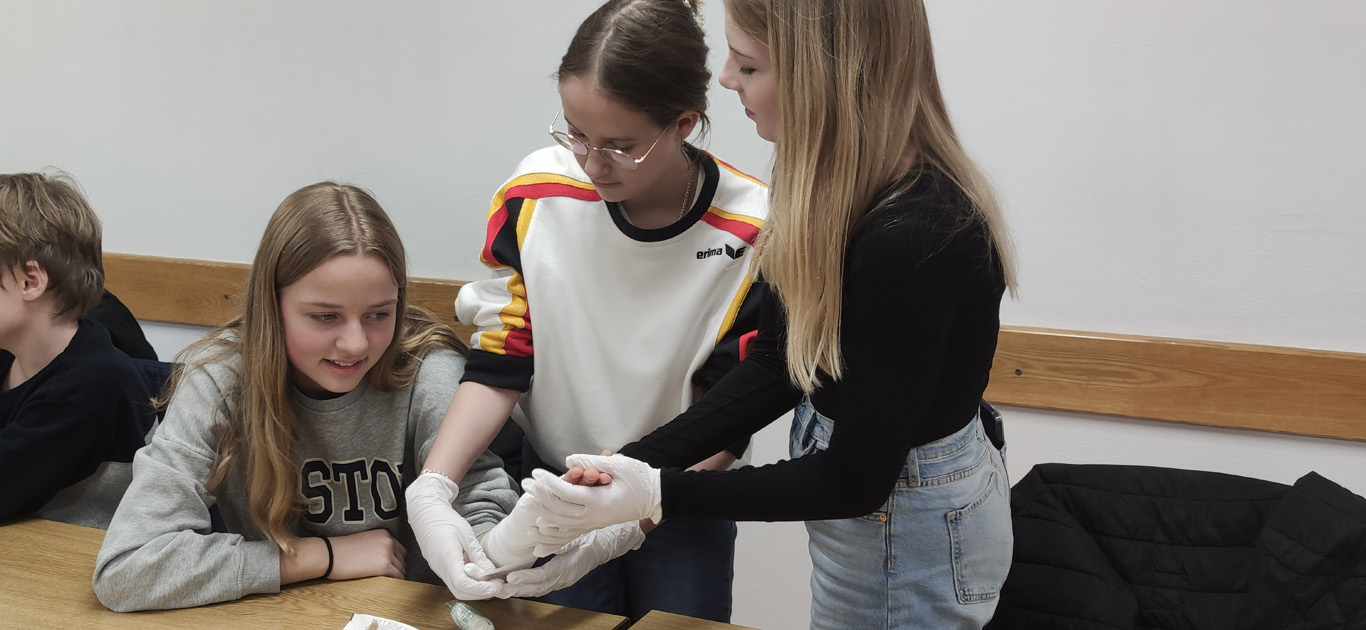 Ganze Jahrgänge begaben sich aber auch auf Exkursionen, so wie die Klasse 7a zu den Maltesern nach Hacklberg. Dort durften sie einen Krankenwagen von innen in Augenschein nehmen und erfuhren, was die wichtigsten Utensilien in einem Notfallkoffer sind. Gemeinsam übten sie das Verbinden von Wunden und Verletzungen. Die Klasse 7c fuhr an die Don-Bosco-Schule für Körperbehinderte in Grubweg, wo man die seit Jahren bestehende Partnerschaft bei gemeinsamen Spielen und Essen auffrischte. Der Wert des Lebens stand im Mittelpunkt bei der Exkursion der 11. Klassen zur Euthanasieanstalt Schloss Hardtheim.