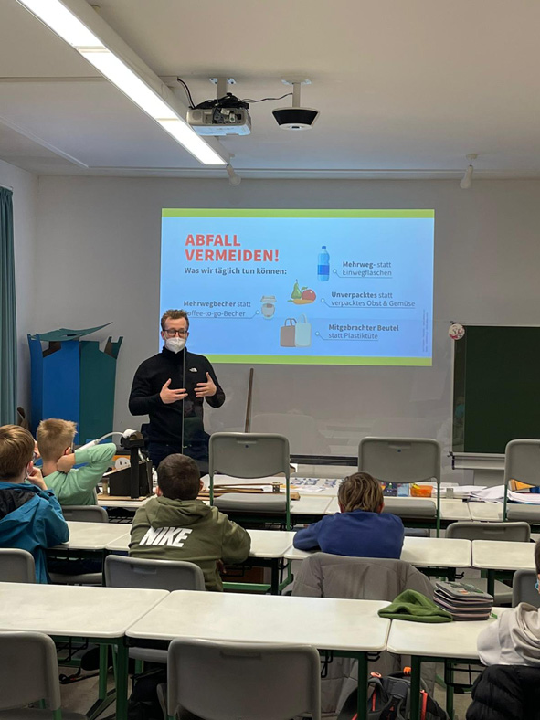 Am Auersperg-Gymnasium soll der Titel „Umweltschule“ nicht nur eine leere Worthülse sein. Aus diesem Grund hat Unterstufenbetreuer Christian Schöttner (2. v.re.) eine Umweltaktion initiiert, bei der Schüler eigene Papiertonnen aus Karton gestalten. Sie verbleiben über mehrere Jahre in der jeweiligen Klasse und sollen der Mülltrennung dienen. Der Ordnungsdienst der jeweiligen Klasse leert dann den Papiermüll wöchentlich eigenverantwortlich aus.