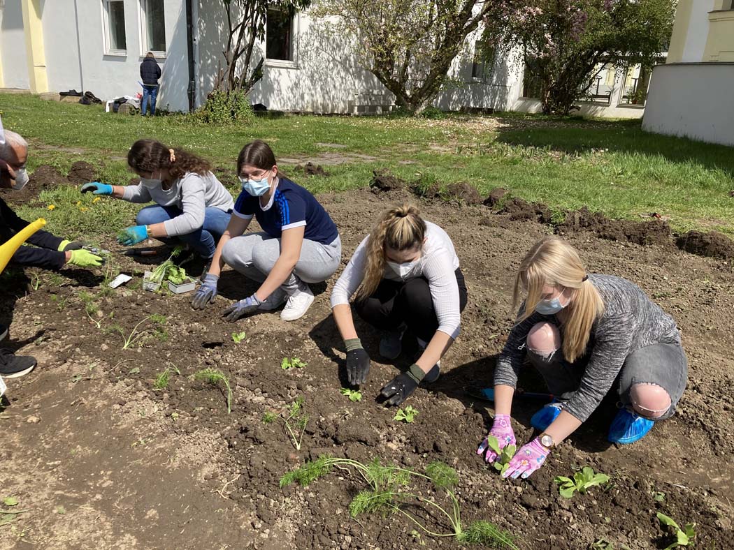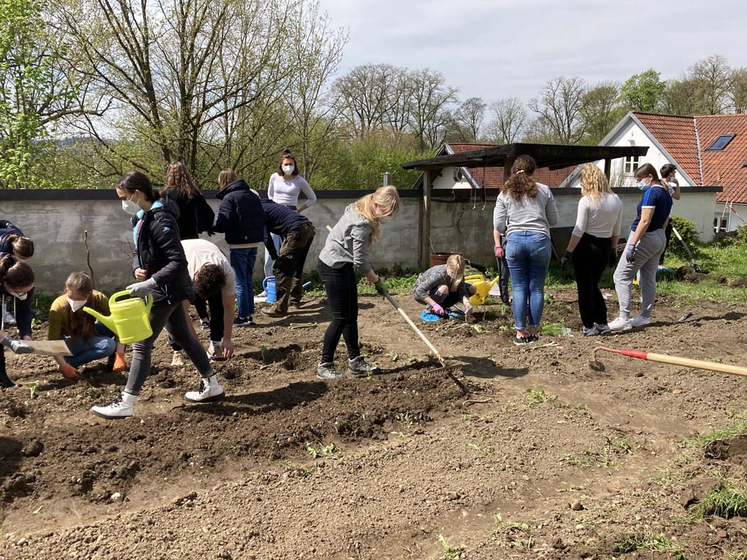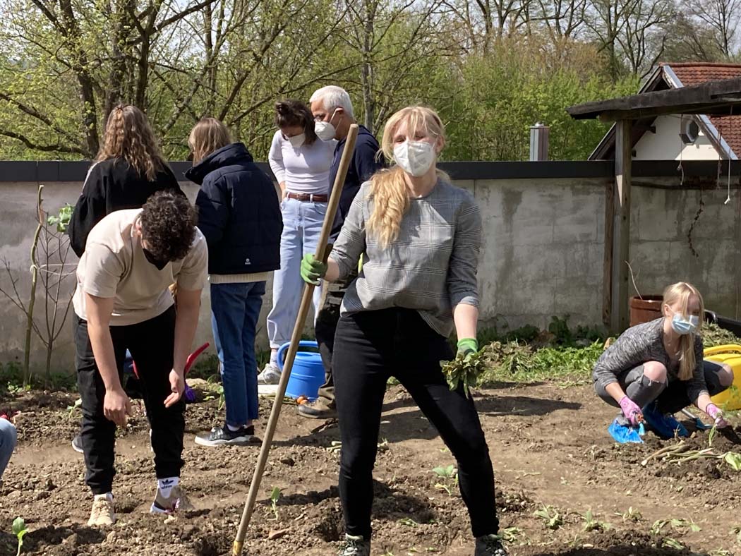 Normalerweise beginnt mit dem Umgraben und Pflanzen die Arbeit für die Schüler/-innen der 5. Jahrgangsstufe im Rahmen des Unterrichts von Natur und Technik. Leider waren diese in diesem Schuljahr aufgrund des Lockdowns noch nicht in der Schule, sodass die Schüler/-innen der Q11 mitanpacken mussten. Sie schafften es in Rekordzeit, die Beete vorzubereiten und Salat-, Rote Beete-, Kohlrabi- und Fenchelpflänzchen einzusetzen.