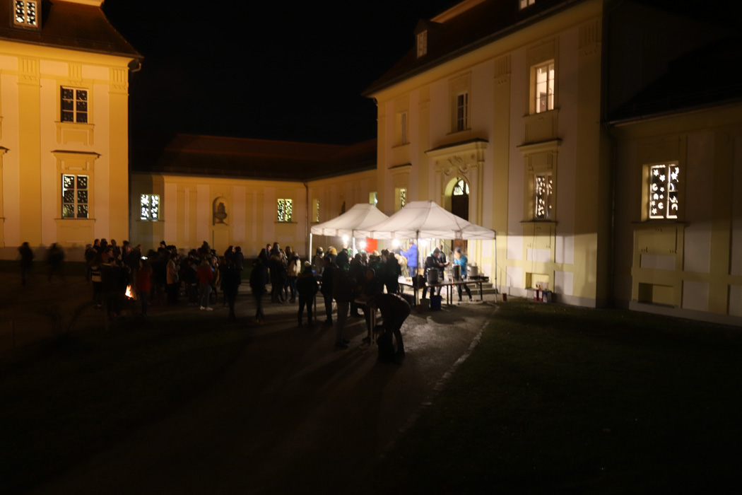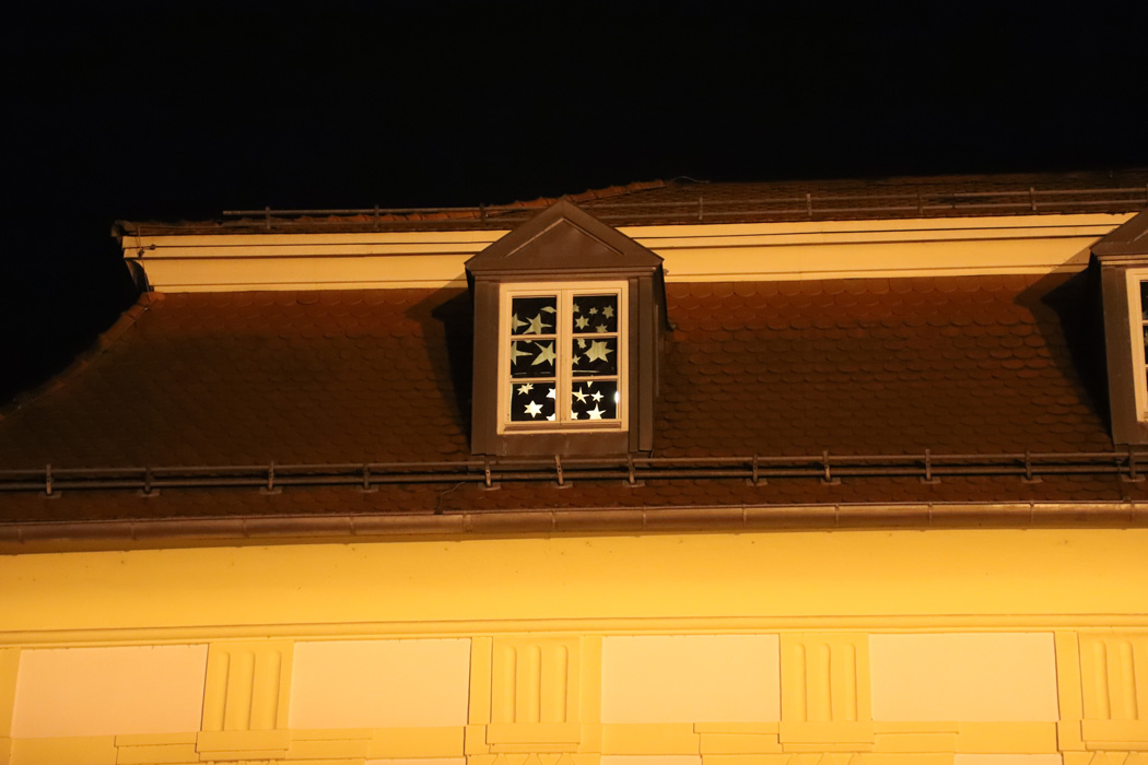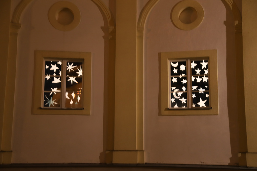 Nach dieser zauberhaften Aufführung kam der Moment, auf den alle gespannt gewartet hatten: Endlich nahm man die Verdunkelung von den Sternenfenstern und das Motto "Sternstunden" wurde an der Hauptfassade und den Fenstern des gesamten Innenhofes sichtbar. Zahlreiche kleine und große Hände hatten zwei Tage lang Sterne ausgeschnitten und die Fenster mit diesen Sternenschablonen beklebt.