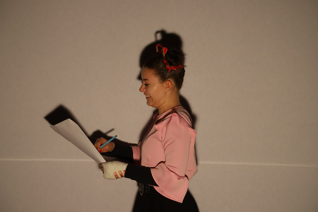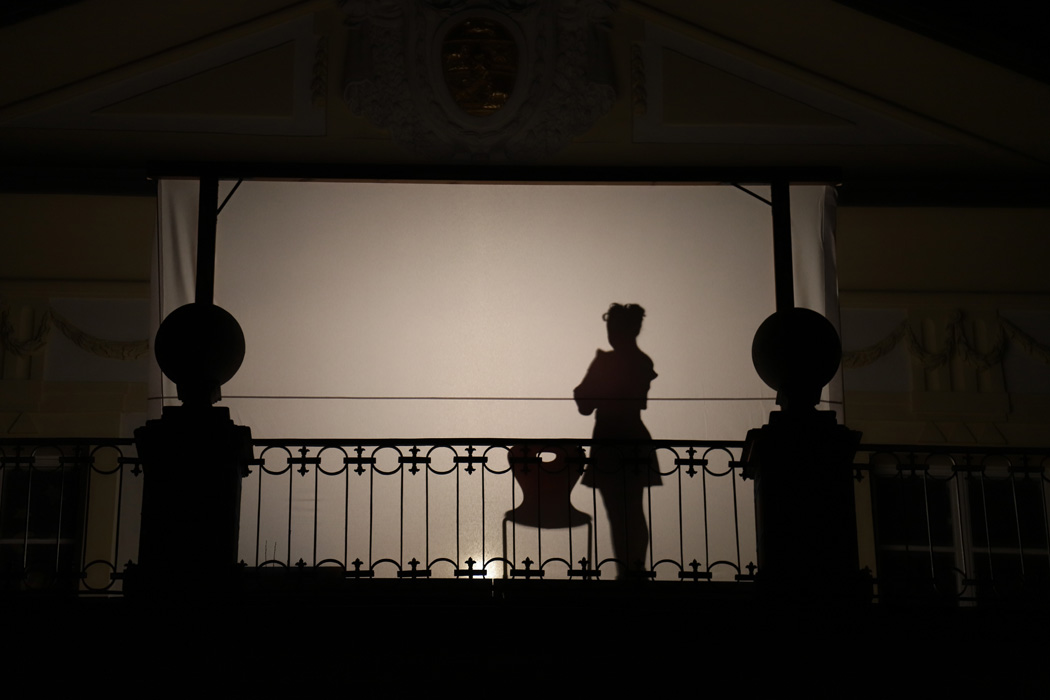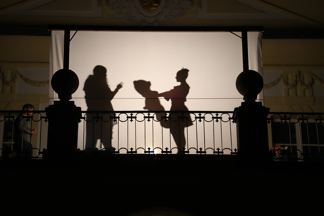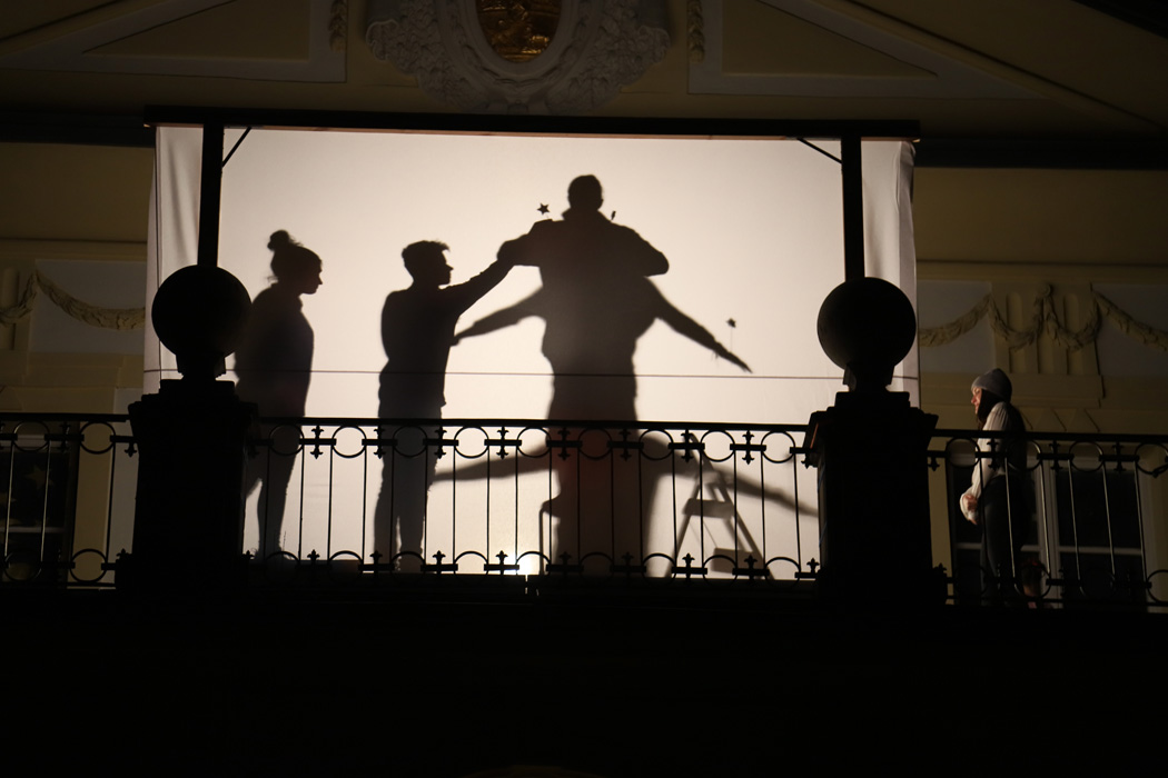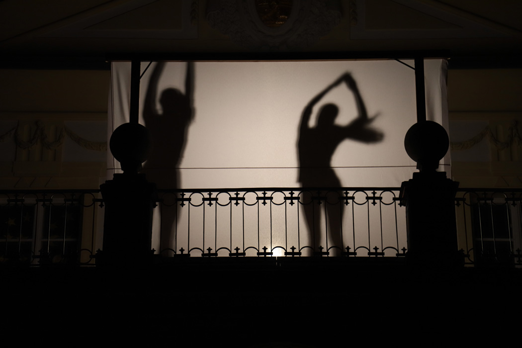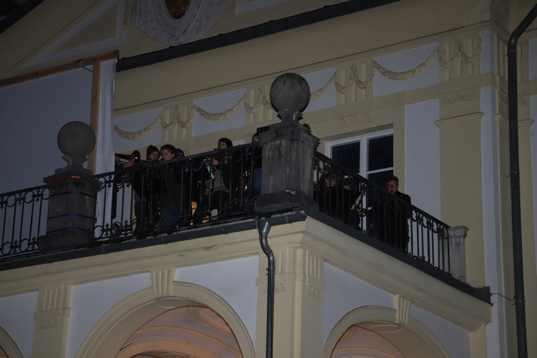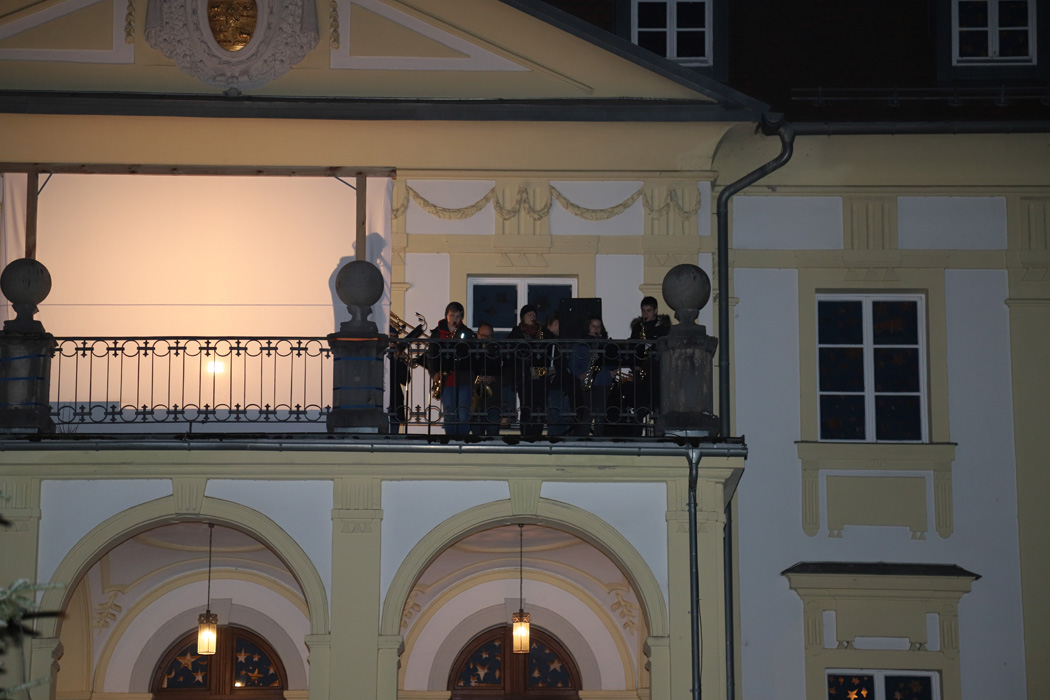 Gegen 19:45 Uhr rief die Bläsergruppe von Christoph Rose vom Balkon des Innenhofs aus alle Anwesenden zum Höhepunkt des Abends herbei. Auf dieser Empore hatte man eine große weiße Leinwand für ein Schattenspiel installiert und beleuchtet. Dahinter tanzten Leni Bäumler und Amelie Hötzendorfer (beide 9a) äußerst anmutig. Dabei waren ihre Körper nur als Umrisse zu sehen. Anschließend verfolgten alle fasziniert eine pantomimisch als Schattenspiel dargestellte Weihnachtsgeschichte, die Frau Stephanie Holly mit Schülern aus unterschiedlichen Klassen einstudiert hatte.