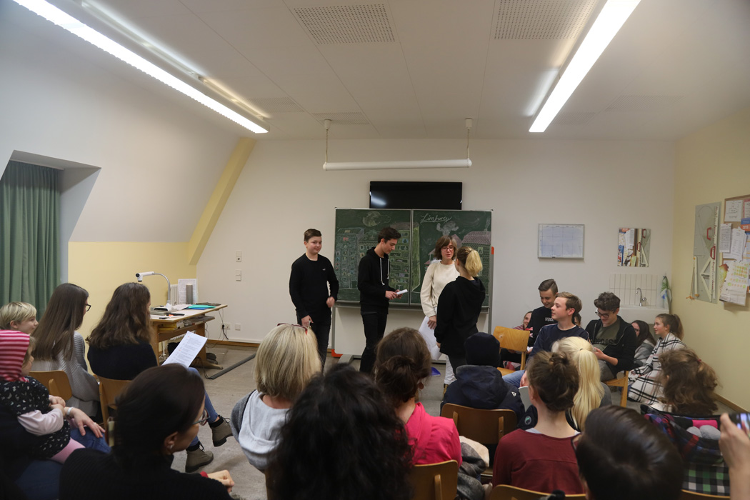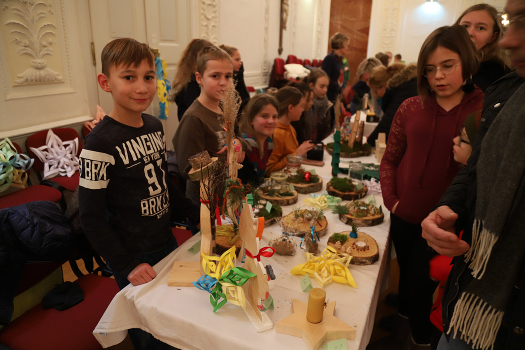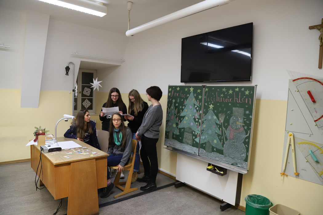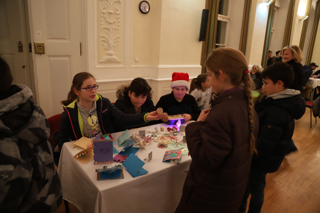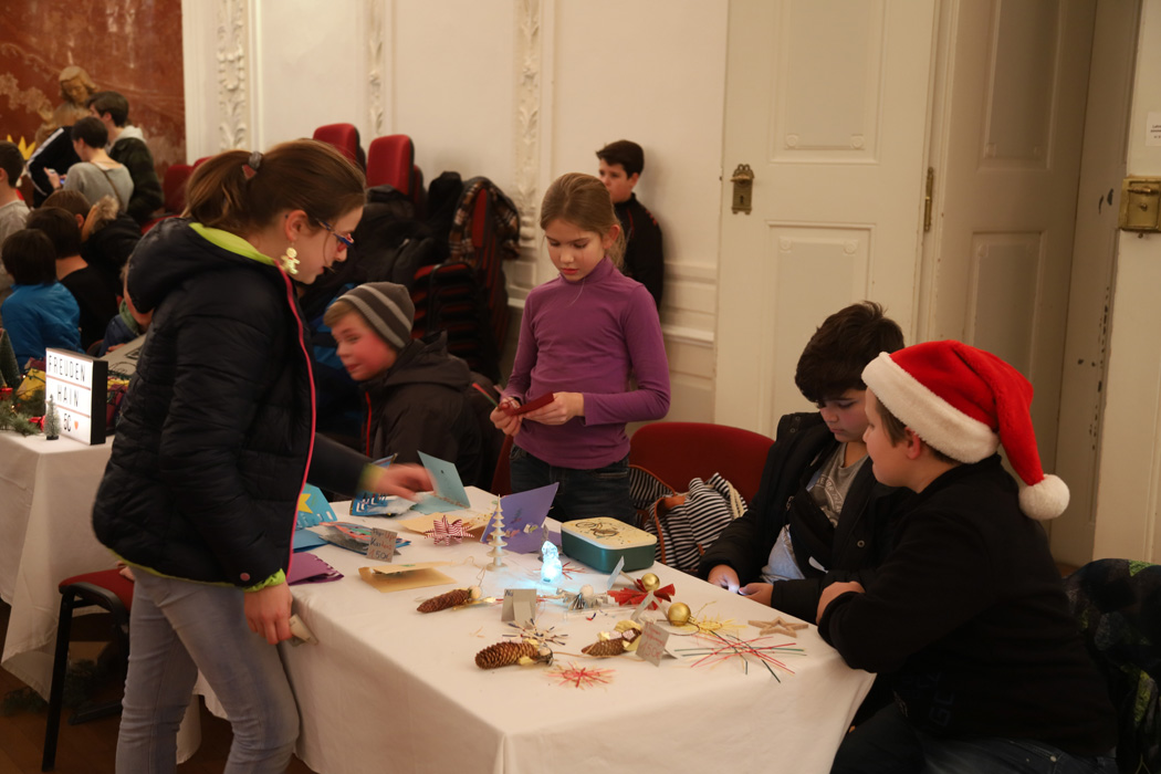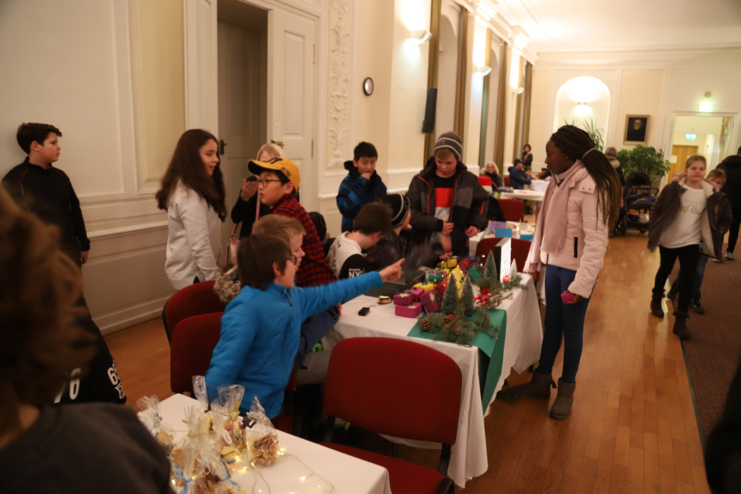 Die 5. und 6. Klassen boten auf einem Basar im Festsaal viel Selbstgebackenes und -gebasteltes an. Besondere Freude bereiteten den Eltern die Krippenspiele der Mittelstufenklassen. Jede der 7., 8. und 9. Klassen hatte in Eigenregie ein szenisches weihnachtliches Spiel einstudiert, das im eigenen Klassenzimmer aufgeführt wurde.