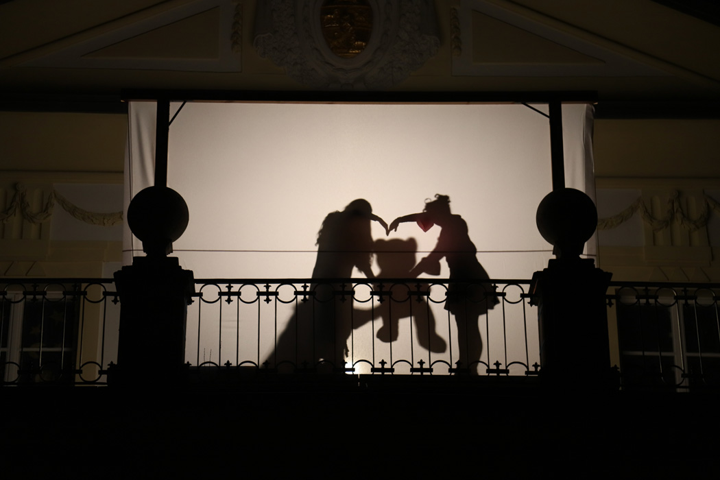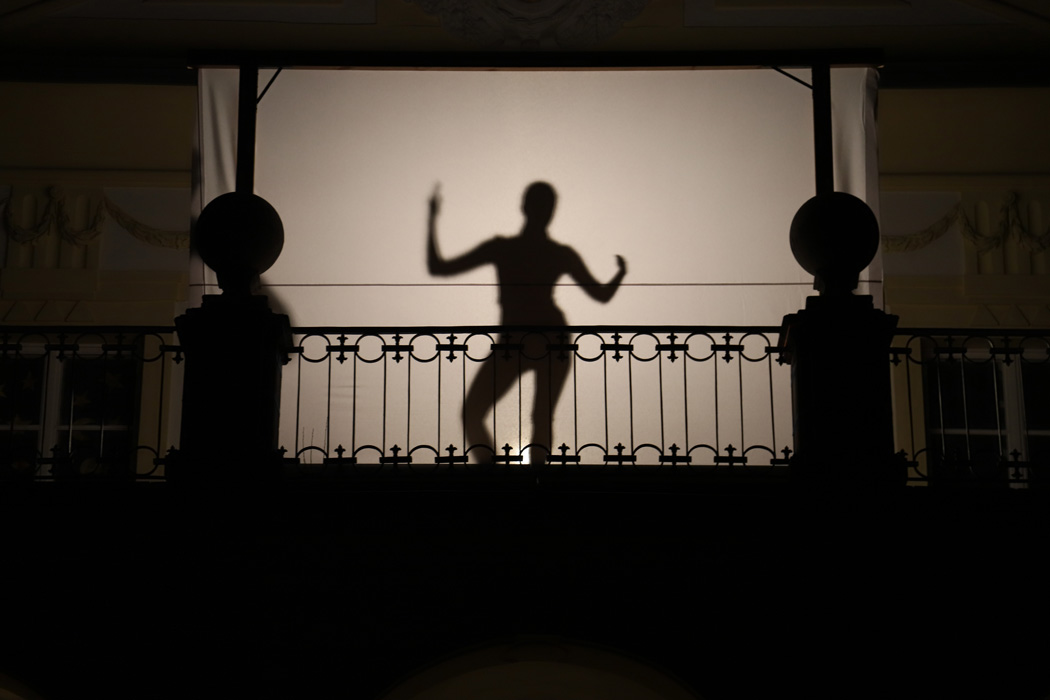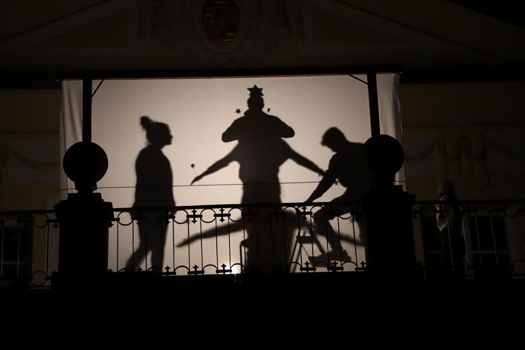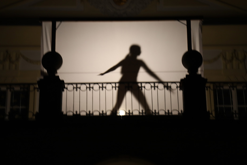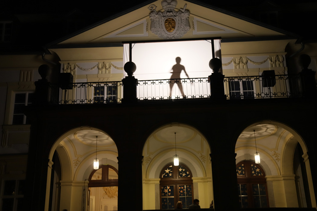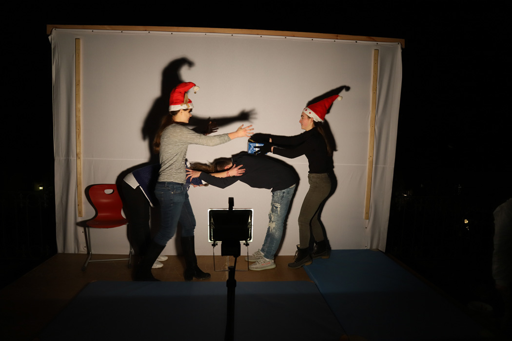 Gegen 19:45 Uhr rief die Bläsergruppe von Christoph Rose vom Balkon des Innenhofs aus alle Anwesenden zum Höhepunkt des Abends herbei. Auf dieser Empore hatte man eine große weiße Leinwand für ein Schattenspiel installiert und beleuchtet. Dahinter tanzten Leni Bäumler und Amelie Hötzendorfer (beide 9a) äußerst anmutig. Dabei waren ihre Körper nur als Umrisse zu sehen. Anschließend verfolgten alle fasziniert eine pantomimisch als Schattenspiel dargestellte Weihnachtsgeschichte, die Frau Stephanie Holly mit Schülern aus unterschiedlichen Klassen einstudiert hatte.