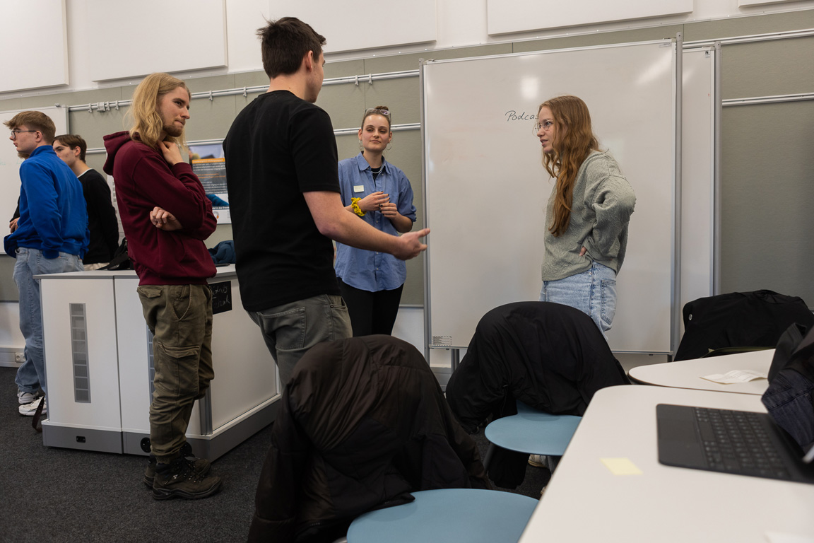 Bei der Auftaktveranstaltung am 24. April stellten die Schülerinnen und Schüler des Auersperg-Gymnasiums ihre Projekte den Studierenden vor. In einem offenen Austausch konnten die Studierenden, die diese Art des Lernens aus ihrer Schulzeit noch nicht kennen, Fragen zur Zielsetzung und zur konkreten Umsetzung stellen. Ihre Aufgabe wird es sein, die noch recht neue Lernform „FreiDay“ zu evaluieren und empirische Daten zu erheben, die es ermöglichen, den Lernerfolg sichtbar zu machen. Der Austausch war für beide Seiten sehr spannend und anregend, die Freudenhainer waren hinterher sichtbar stolz, ihre Vorträge in diesem Kreis gut gemeistert zu haben.