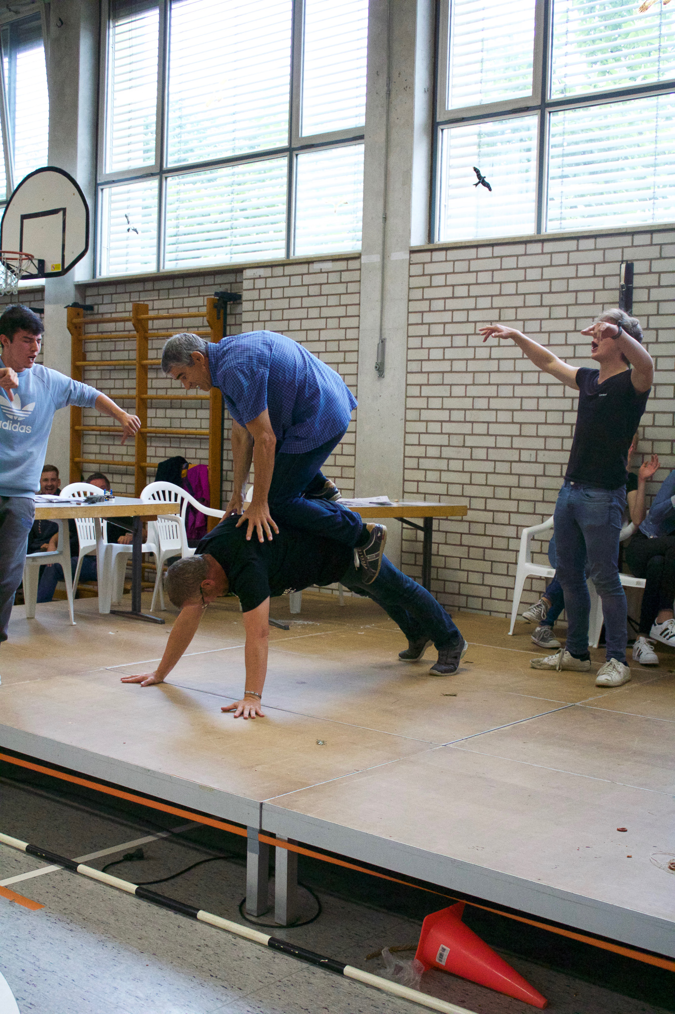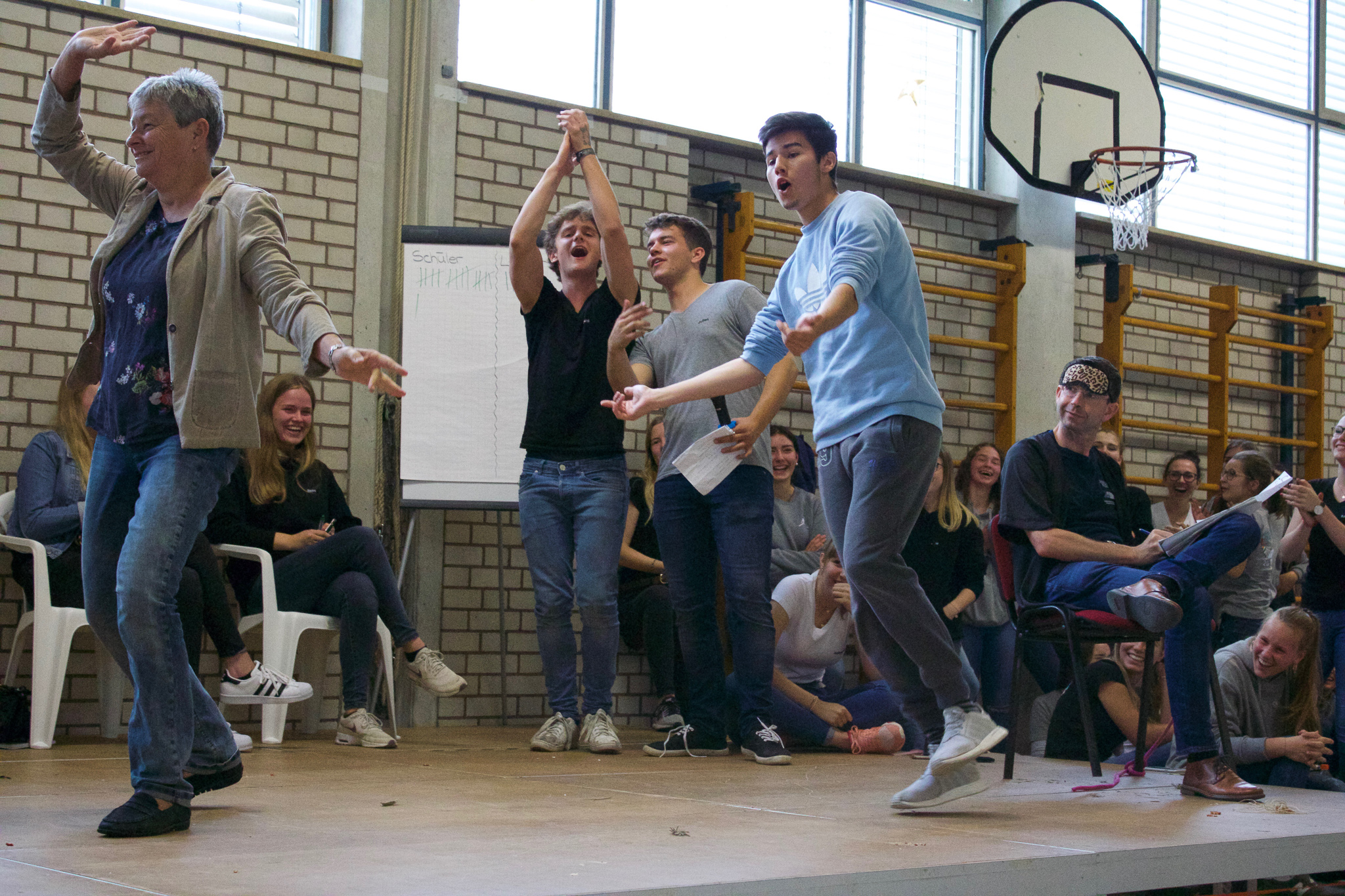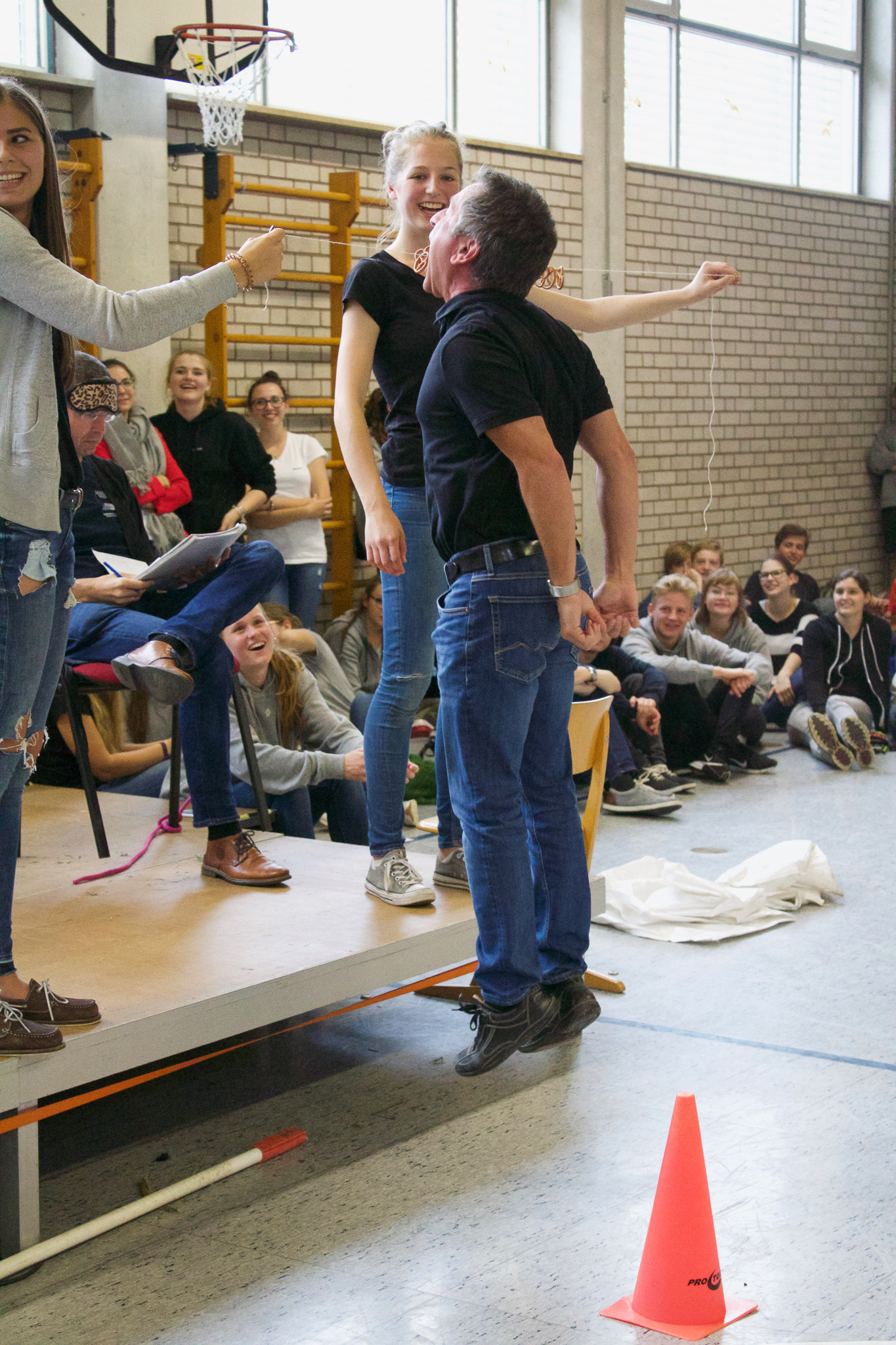 Auf dem Stundenplanbildschirm lief an diesem Morgen die Reklame für die Abizeitung und nach der Pasue wurde der Direktor in Gewahrsam genommen und in die Turnhalle abgeführt. Es war die Aufgabe des Lehrerkollegiums, ihn durch einen Parcours, bei dem die Lehrer gegen Schüler der Unter- und Mittelstufe antraten, auszulösen. Das gelang natürlich nicht, weil aus Sicht der Lehrer die Punktevergabe sehr kreativ war. Da blieb Herrn Zitzl nur noch übrig, sich durch ein selbstverfasstes Gedicht selbst zu retten. Mit einem Essen für das Lehrerkollegium endete die Aktion der Abiturienten. Insgesamt ein gelungener Streich, an dem alle Freude hatten.