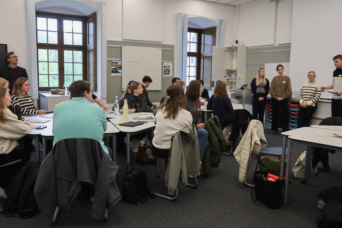 Bei der Auftaktveranstaltung am 24. April stellten die Schülerinnen und Schüler des Auersperg-Gymnasiums ihre Projekte den Studierenden vor. In einem offenen Austausch konnten die Studierenden, die diese Art des Lernens aus ihrer Schulzeit noch nicht kennen, Fragen zur Zielsetzung und zur konkreten Umsetzung stellen. Ihre Aufgabe wird es sein, die noch recht neue Lernform „FreiDay“ zu evaluieren und empirische Daten zu erheben, die es ermöglichen, den Lernerfolg sichtbar zu machen. Der Austausch war für beide Seiten sehr spannend und anregend, die Freudenhainer waren hinterher sichtbar stolz, ihre Vorträge in diesem Kreis gut gemeistert zu haben.