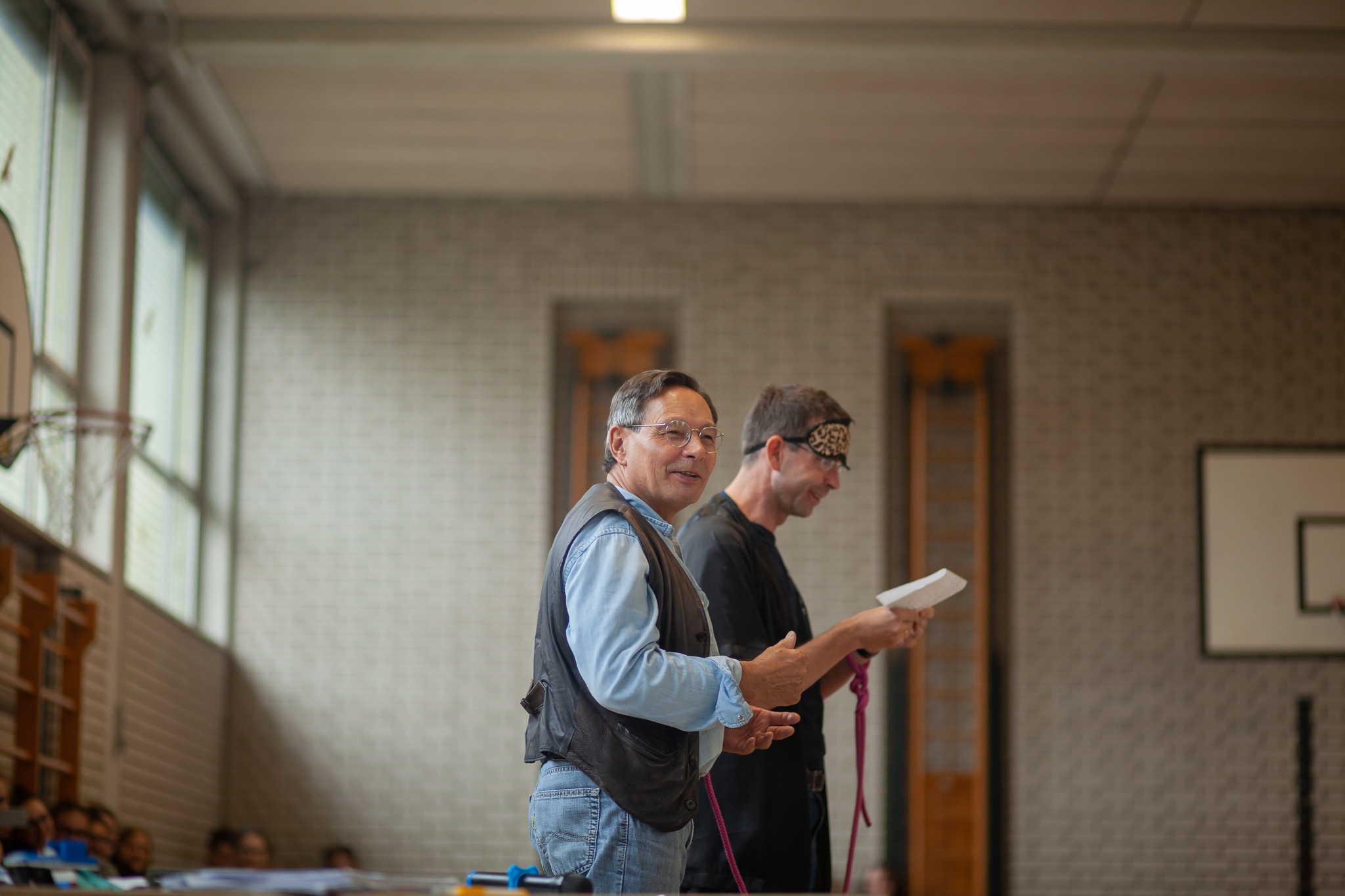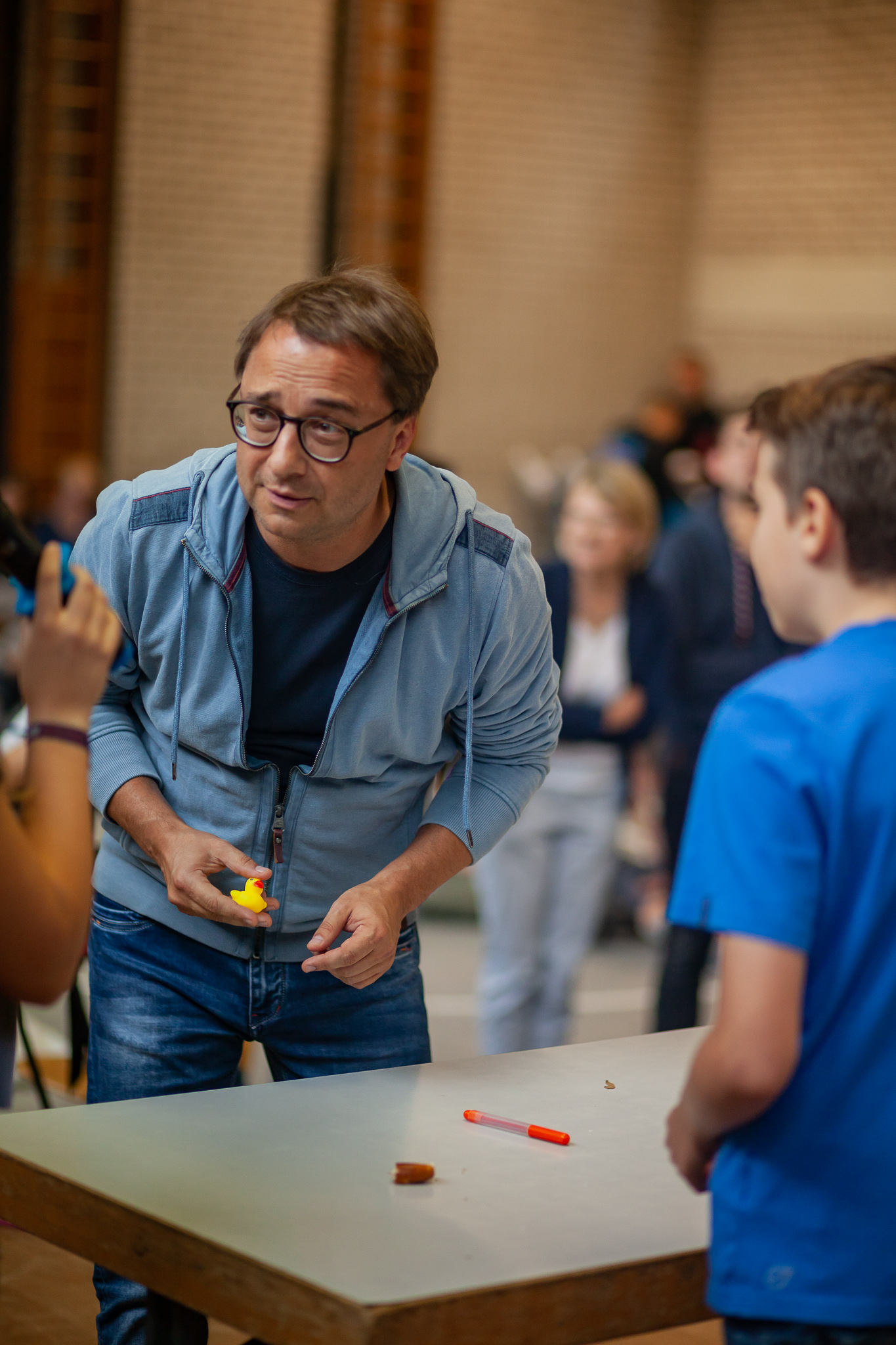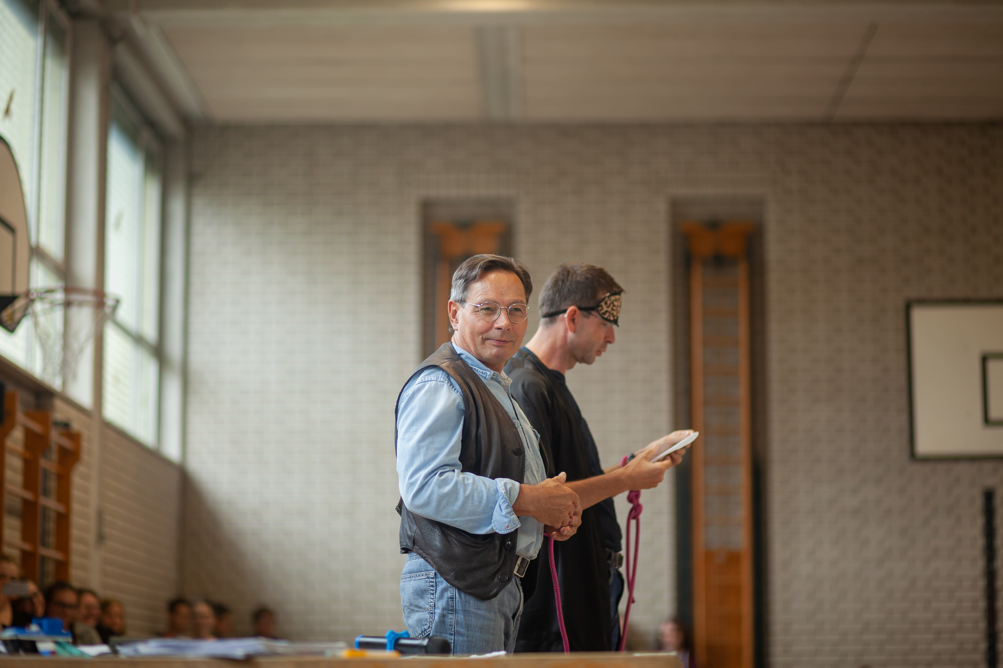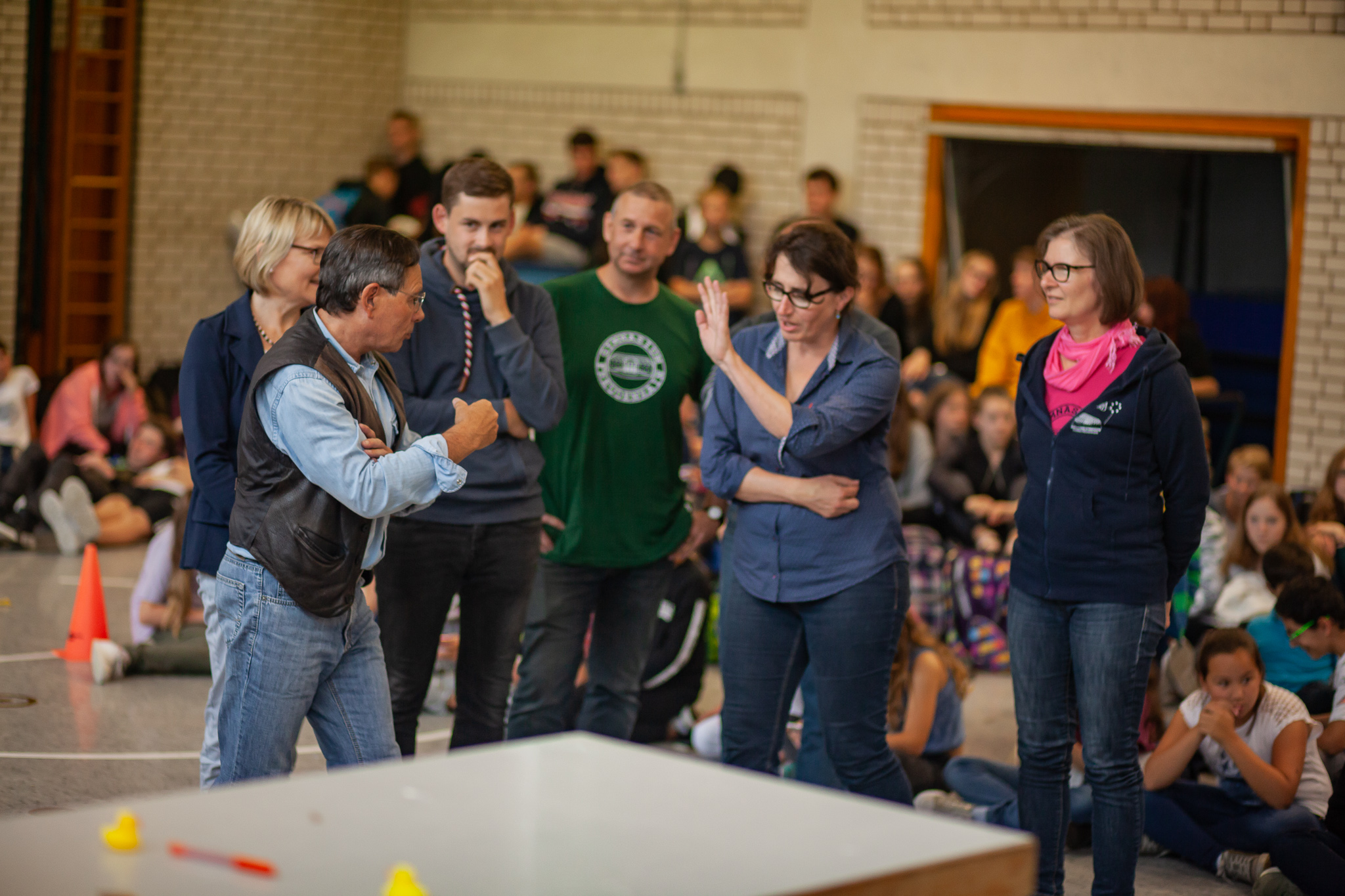 Auf dem Stundenplanbildschirm lief an diesem Morgen die Reklame für die Abizeitung und nach der Pasue wurde der Direktor in Gewahrsam genommen und in die Turnhalle abgeführt. Es war die Aufgabe des Lehrerkollegiums, ihn durch einen Parcours, bei dem die Lehrer gegen Schüler der Unter- und Mittelstufe antraten, auszulösen. Das gelang natürlich nicht, weil aus Sicht der Lehrer die Punktevergabe sehr kreativ war. Da blieb Herrn Zitzl nur noch übrig, sich durch ein selbstverfasstes Gedicht selbst zu retten. Mit einem Essen für das Lehrerkollegium endete die Aktion der Abiturienten. Insgesamt ein gelungener Streich, an dem alle Freude hatten.