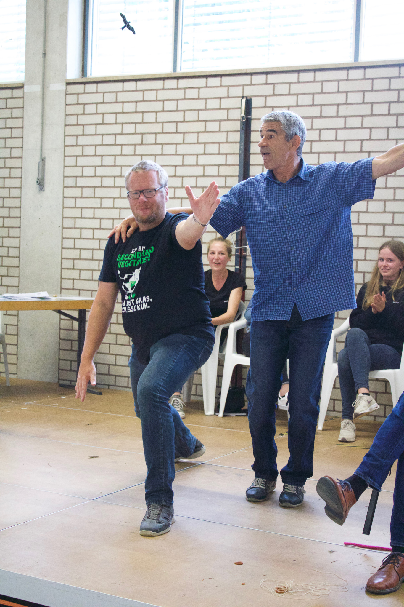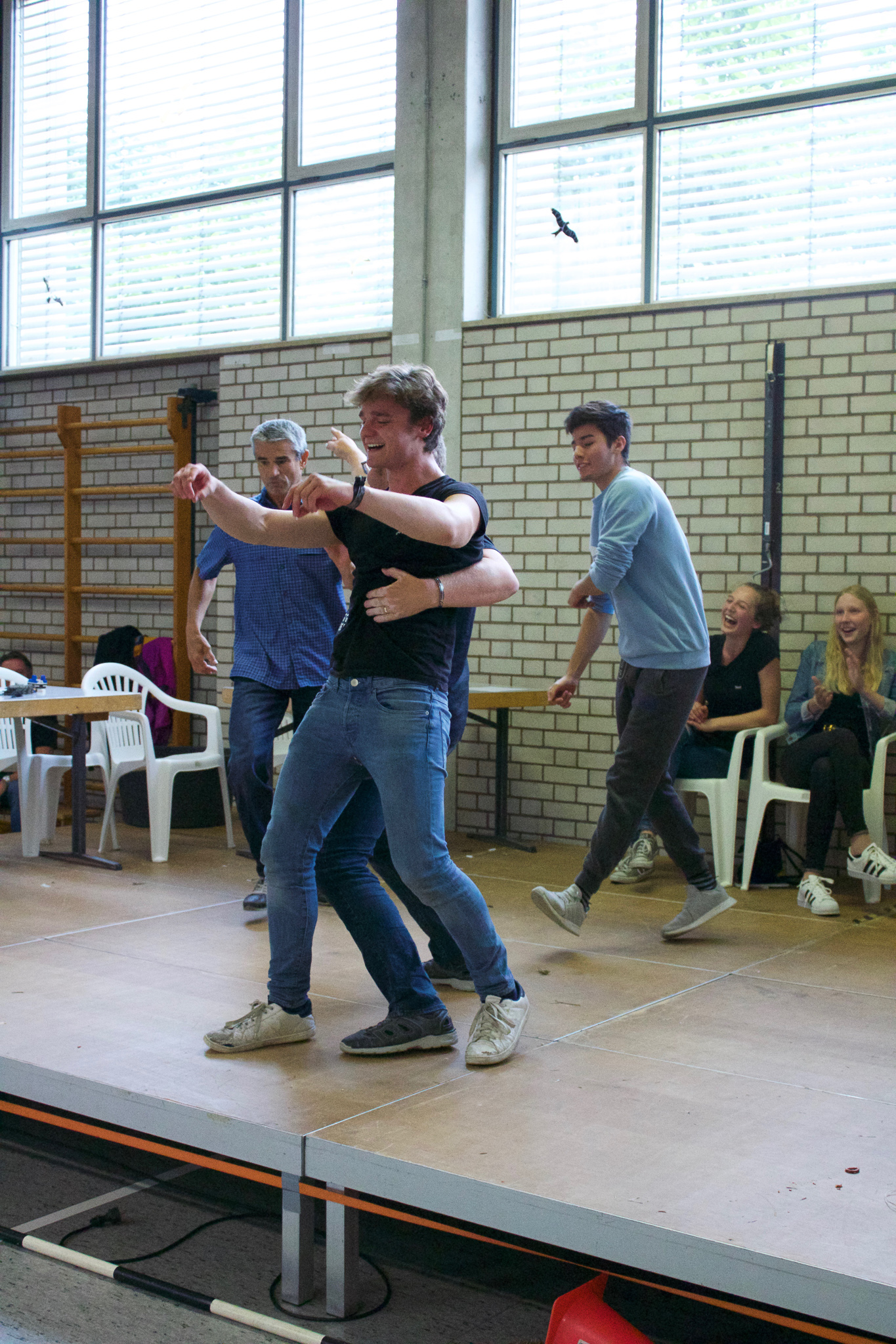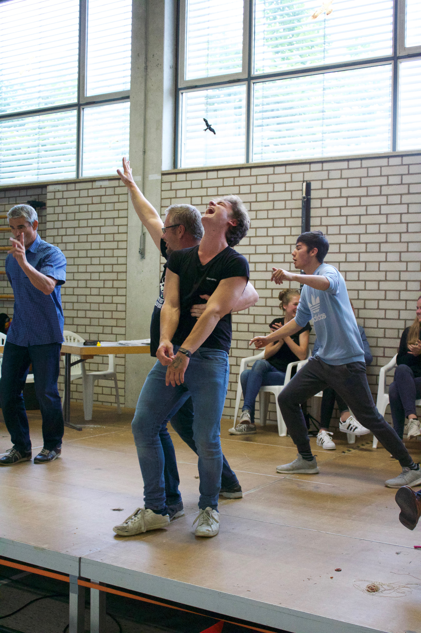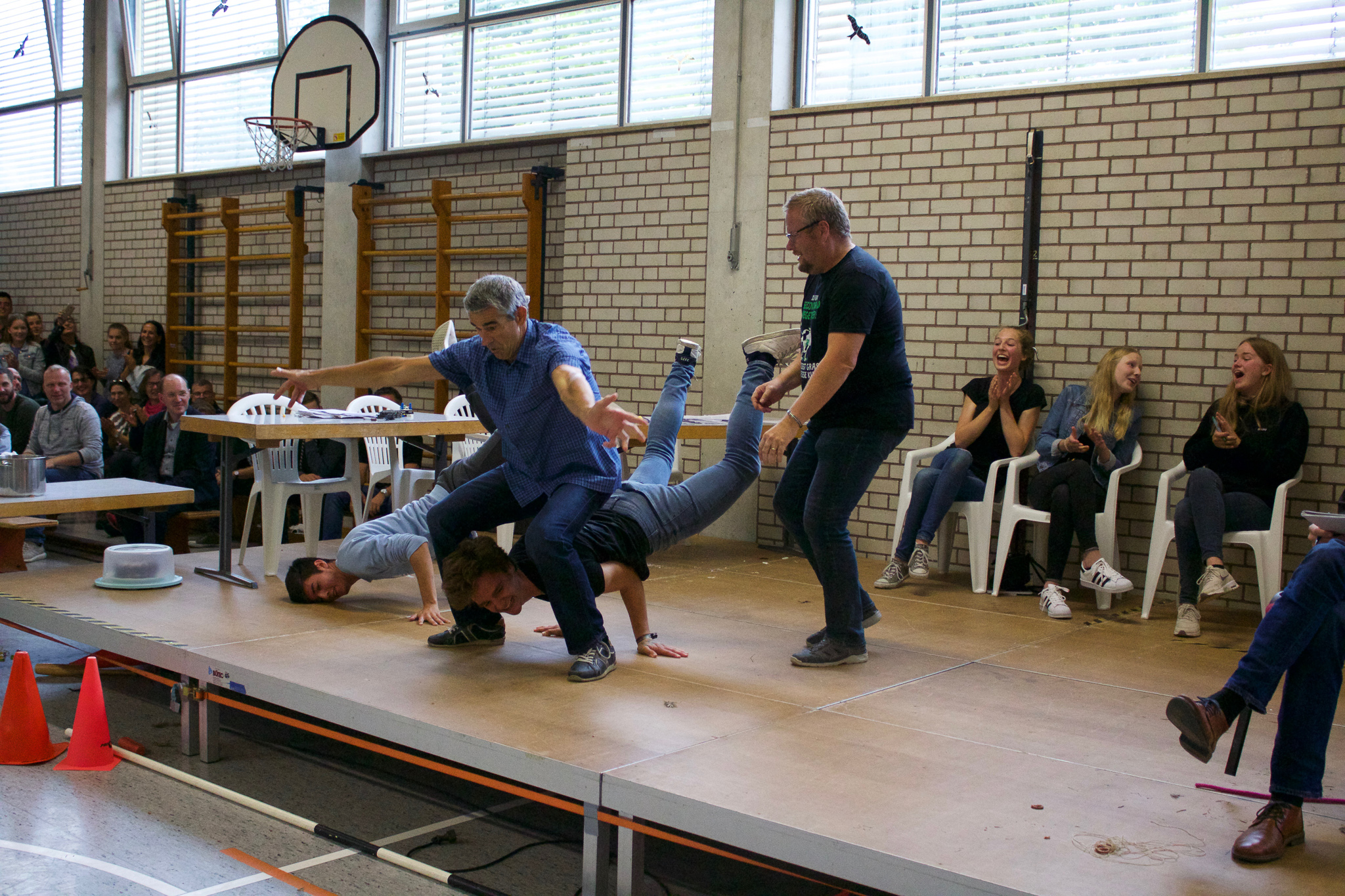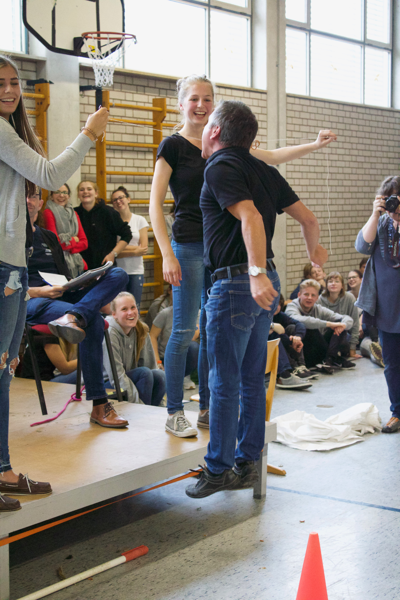 Auf dem Stundenplanbildschirm lief an diesem Morgen die Reklame für die Abizeitung und nach der Pasue wurde der Direktor in Gewahrsam genommen und in die Turnhalle abgeführt. Es war die Aufgabe des Lehrerkollegiums, ihn durch einen Parcours, bei dem die Lehrer gegen Schüler der Unter- und Mittelstufe antraten, auszulösen. Das gelang natürlich nicht, weil aus Sicht der Lehrer die Punktevergabe sehr kreativ war. Da blieb Herrn Zitzl nur noch übrig, sich durch ein selbstverfasstes Gedicht selbst zu retten. Mit einem Essen für das Lehrerkollegium endete die Aktion der Abiturienten. Insgesamt ein gelungener Streich, an dem alle Freude hatten.
