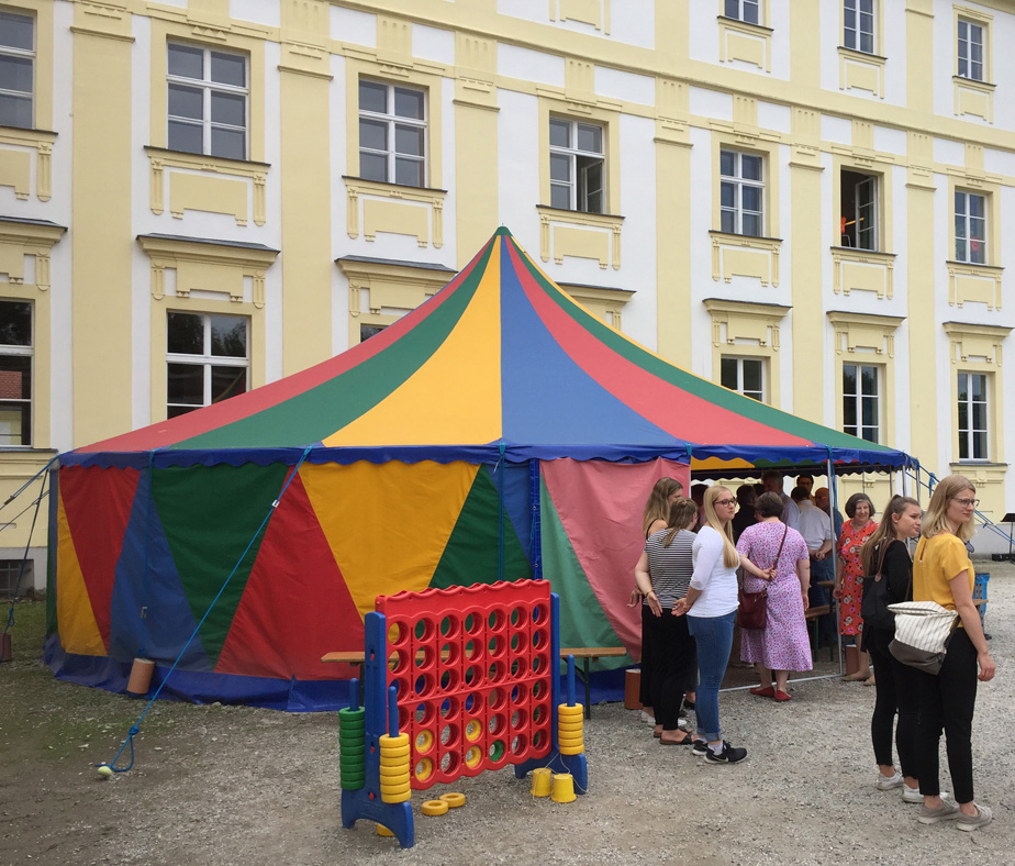 Wer glaubt, dass unsere Schule in den großen Ferien in einen Dornröschenschlaf versinkt, der irrt sich gewaltig. Wie jedes Jahr findet die Ferienfreizeit des Kinderschutzbundes in den ersten drei Augustwochen auf Schloss Freudenhain statt, an der 160 Kinder im Alter von drei bis zwölf Jahren täglich teilnehmen. Das vielfältige Programm beginnt um 7:30 Uhr und wird von vielen Ehrenamtlichen gestaltet, die sch zum Teil schon jahrelang freiwillig zur Verfügung stellen und dafür ihre Ferien bzw. ihren Uralub opfern. Ihnen und den vielen Sponsoren dankte Julia Stern, Vorsitzende des Kinderschutzbundes, beim "Fest der Freunde" am 7. August besonders.