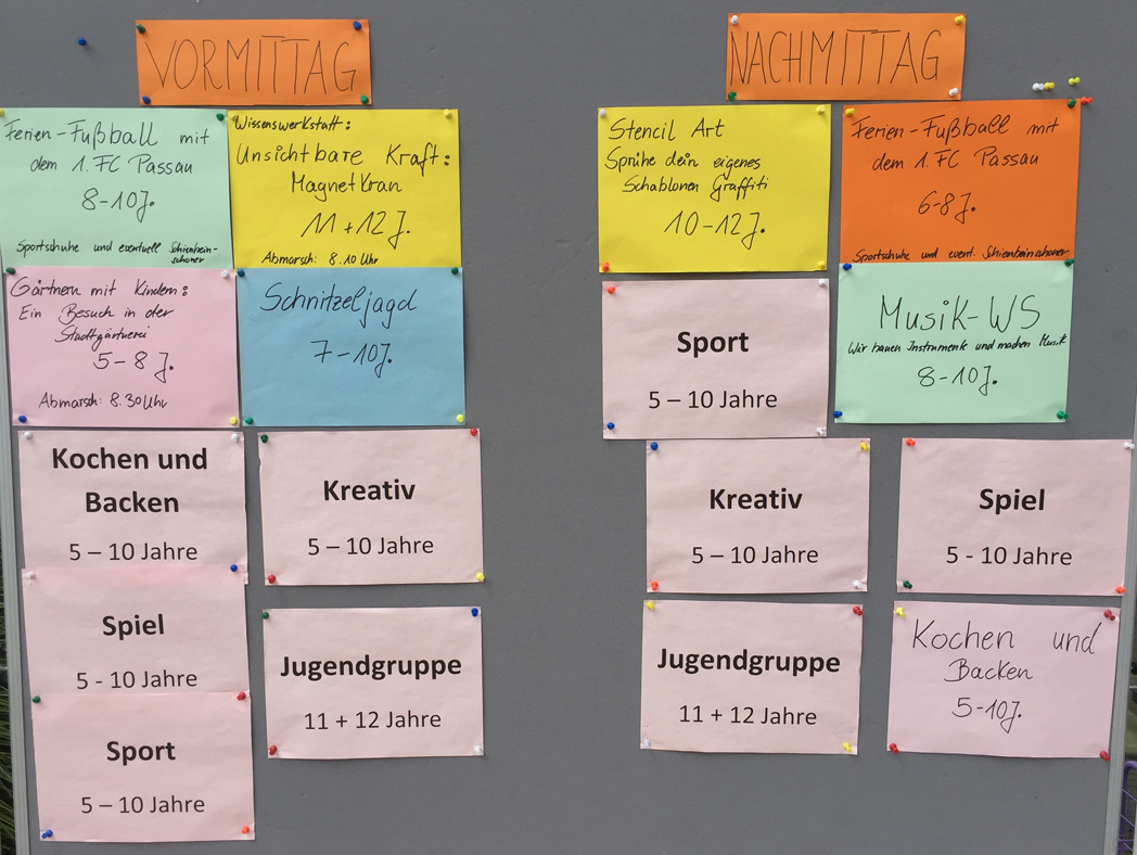 Zu den Unterstützern dieser Maßnahme gehört z.B. der Lions Club Passau, der in diesem Jahr erstmalig einen Fahrdienst organisiert, um Flüchtlingskinder von ihren Unterkünften nach Freudenhain zu bringen, wo sie dann vormittags an einem Deutschkurs und nachmittags am Freizeitprgramm teilnehmen können. Aber auch die Sparkasse Passau, die Raiffeisenbank, der Hacklberger Frauenbund und nicht zuletzt unsere Schule durch die kostenlose Überlassung des Geländes und der Räume unterstützen die Ferienbetreuung. Die Kinder sangen den Sponsoren ein Ständchen und hatten die Tische für das Mittagessen liebevoll gedeckt. Auch für die Nachspeise, selbstgebackene Muffins und Blätterteigrosen, hatten sie gesorgt.