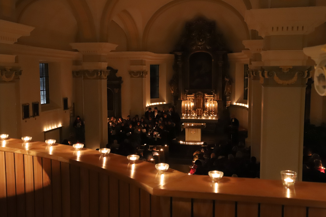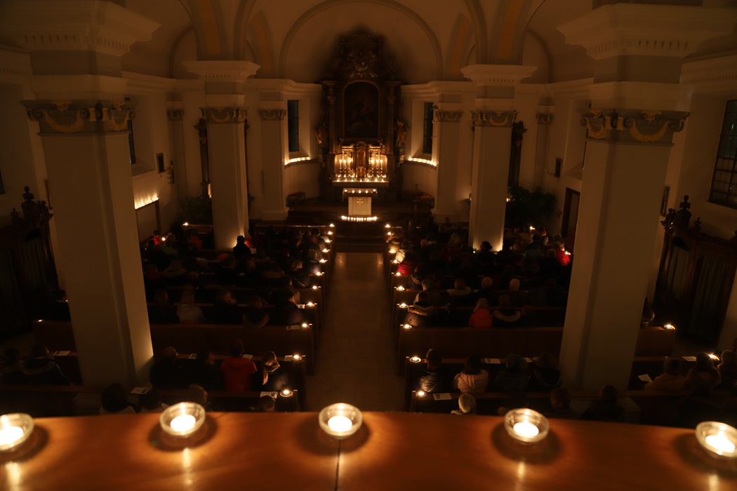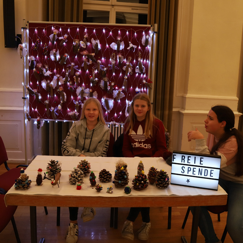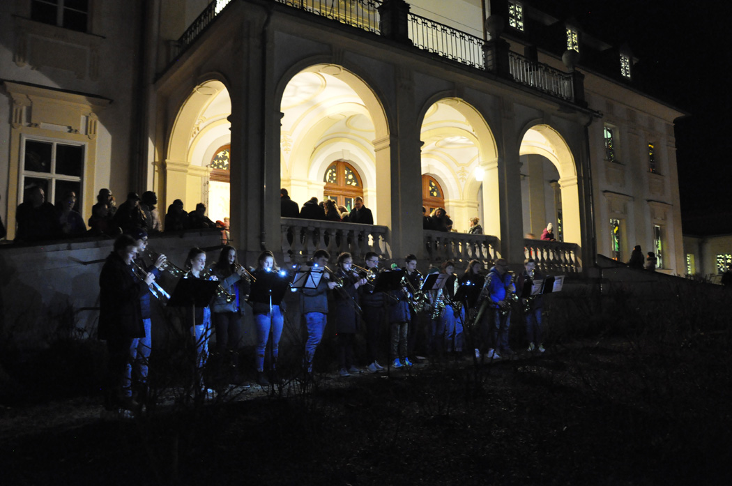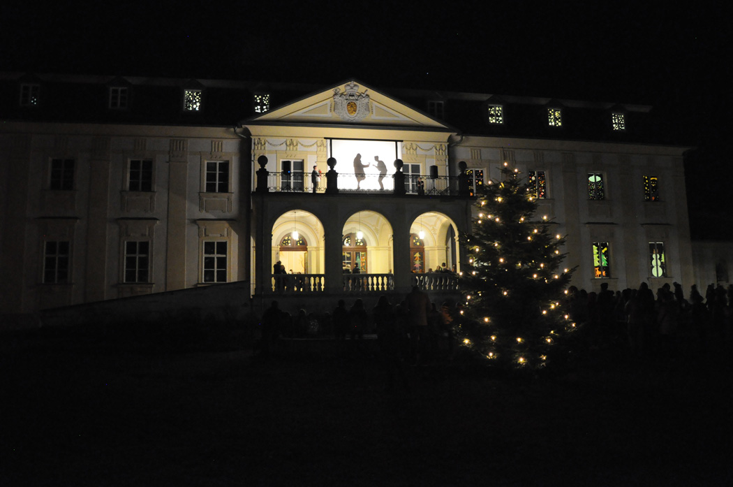 Zweimal an diesem Abend gab es die Gelegenheit zu einem besinnlichen Gottesdienst in der Schlosskirche, wo meditative Texte abwechselnd mit englischen Christmas-Carols vorgetragen wurden, arrangiert von Theresia Kollmann und André Urbanczyk. Den Höhepunkt bildete aber die festliche Illuminierung der Hauptfassade, die die Bläsergruppe unter Leitung von Christoph Rose mit weihnachtlichen Weisen ankündigte. Das durch ein Schattenspiel veranschaulichte und von Stephanie Holly mit der Theatergruppe einstudierte Märchen „Die