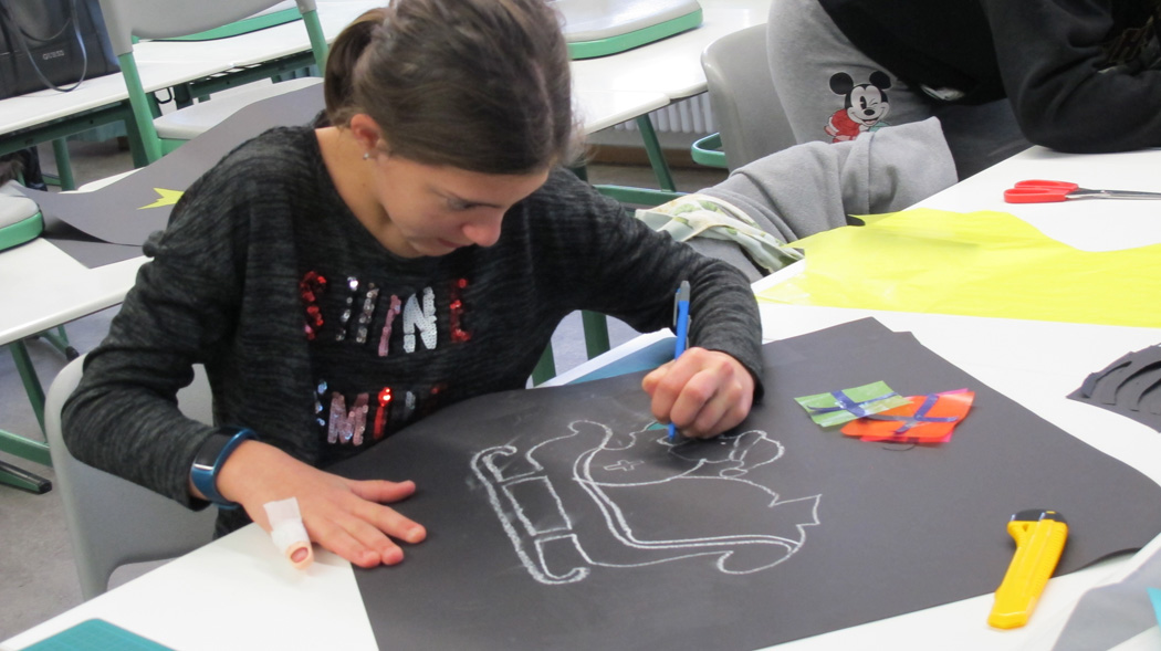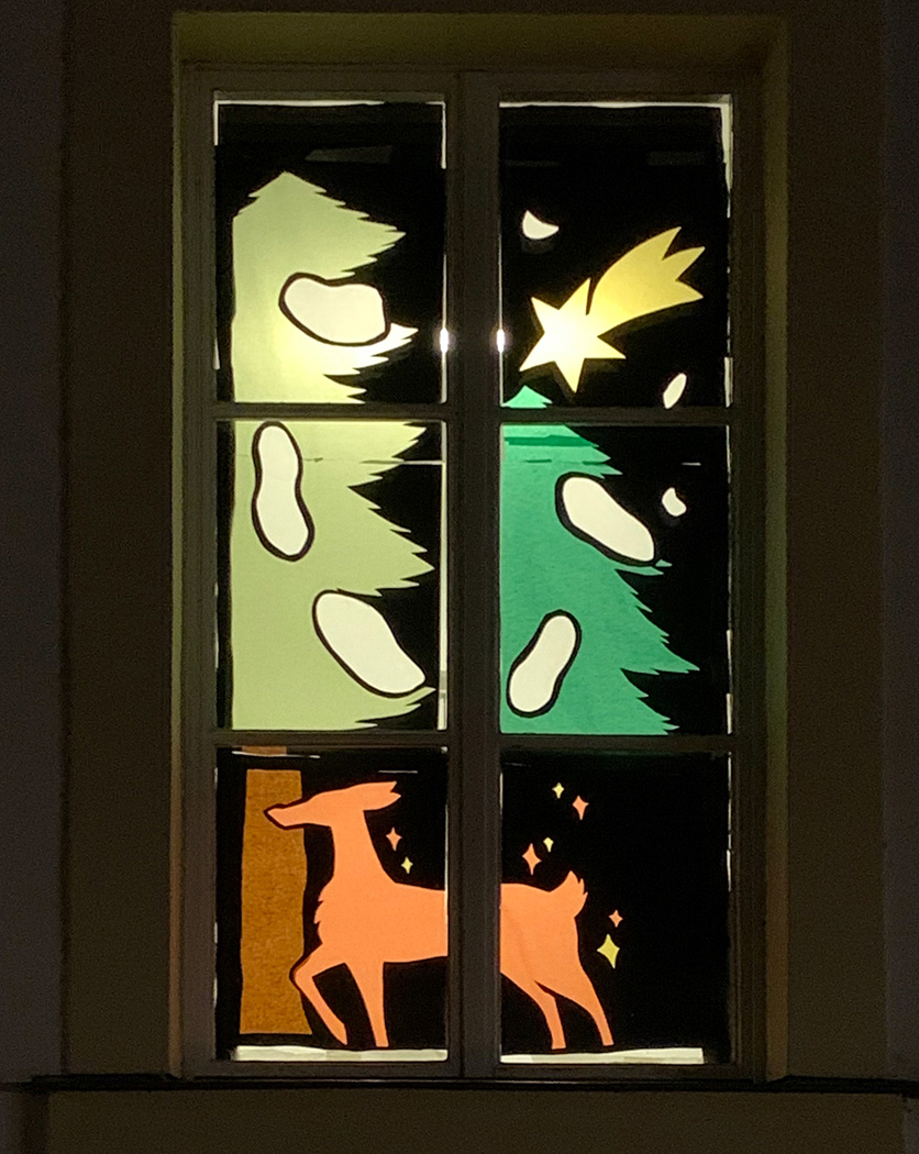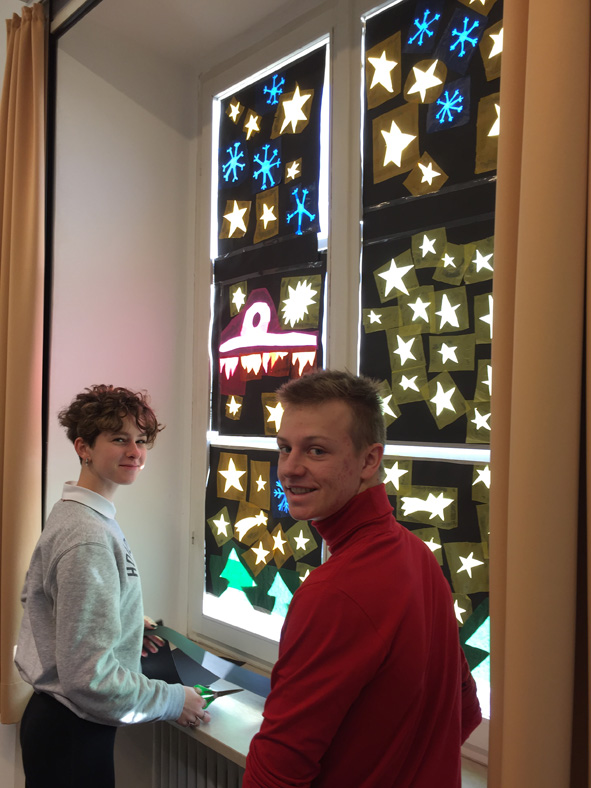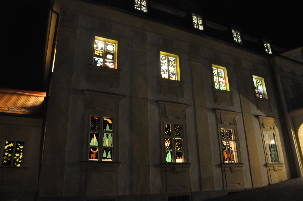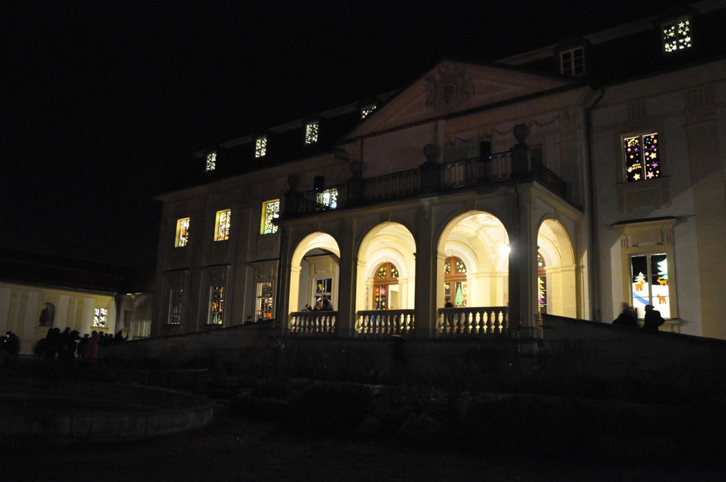 Sterntaler“ stimmte alle Besucher auf das Fest der Liebe und des Gebens ein. Dann wurden nacheinander die Fenster der Hauptfassade erhellt und zauberten Winterlandschaften, weihnachtliche Motive und einen Sternenhimmel herbei. In mühevoller Schneide- und Klebearbeit hatte jede Klasse ein Fenster des Schlossgebäudes gestaltet, das nun als Ganzes den Zusammenhalt der Schulfamilie symbolisierte, die das Weihanchtsfest freudig erwartet.