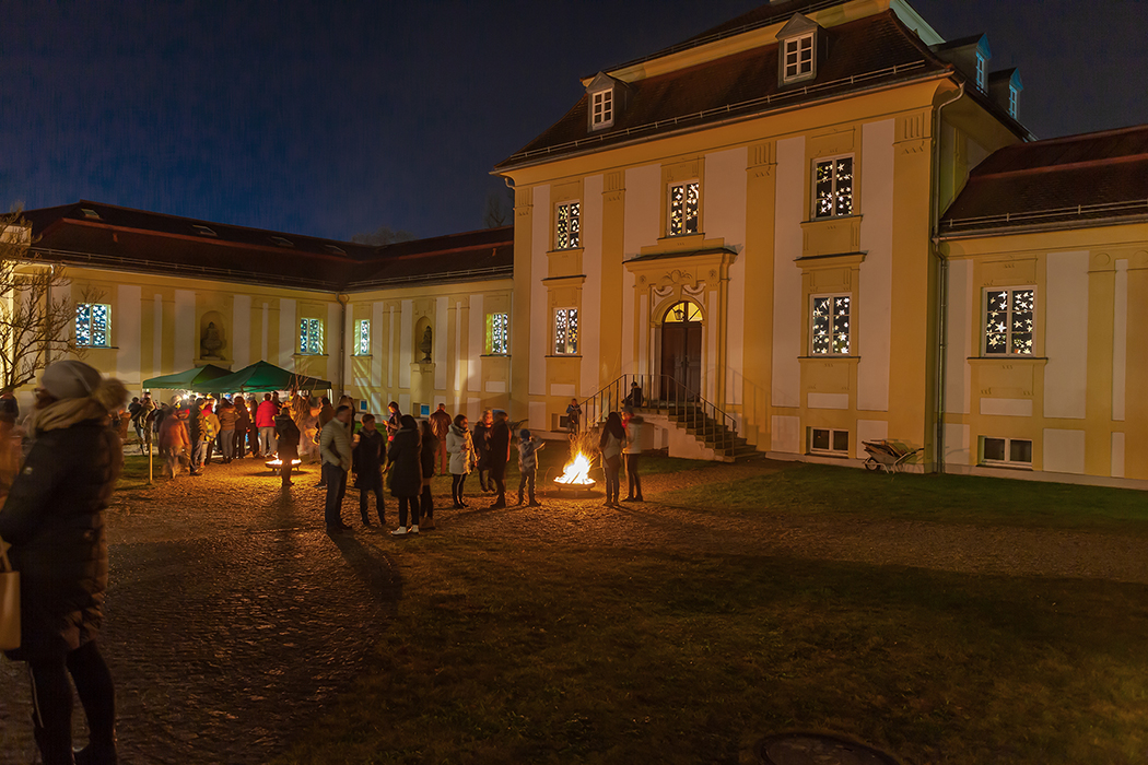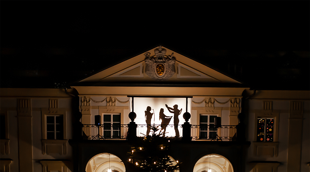 Zweimal an diesem Abend gab es die Gelegenheit zu einem besinnlichen Gottesdienst in der Schlosskirche, wo meditative Texte abwechselnd mit englischen Christmas-Carols vorgetragen wurden, arrangiert von Theresia Kollmann und André Urbanczyk. Den Höhepunkt bildete aber die festliche Illuminierung der Hauptfassade, die die Bläsergruppe unter Leitung von Christoph Rose mit weihnachtlichen Weisen ankündigte. Das durch ein Schattenspiel veranschaulichte und von Stephanie Holly mit der Theatergruppe einstudierte Märchen „Die