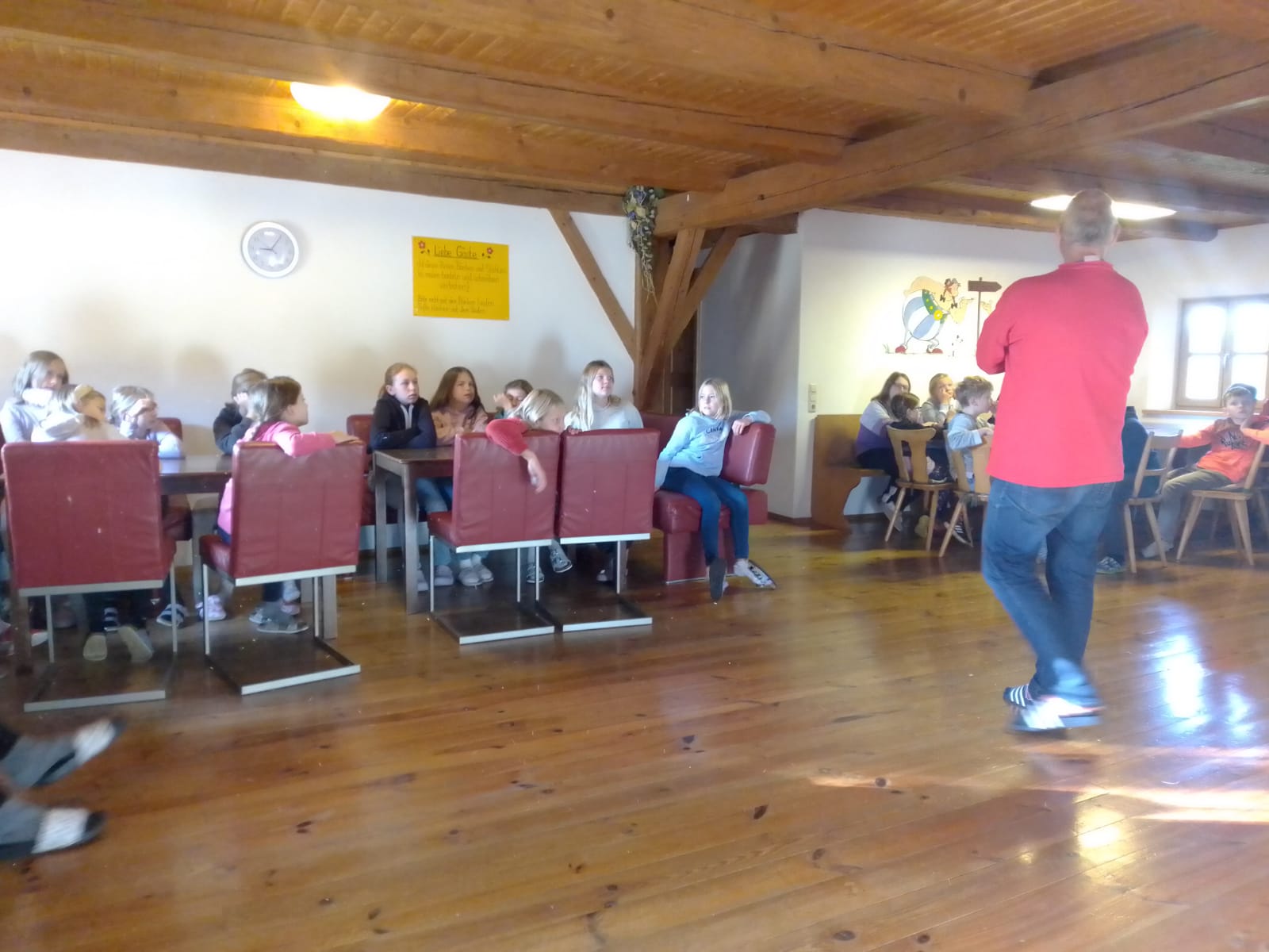 Auch die Klassensprecherwahl fand während des Bauerhofaufenthaltes statt, nachdem Herr Schöttner zuvor ausführlich auf die Aufgaben und Funktion der SMV hingewiesen hatte. Mit großer Ernsthaftigkeit wurde schließlich von den Schülerinnen und Schüler eine demokratische Entscheidung getroffen, die in der Hektik des Schulalltages sicherlich untergegangen wäre. Ein Höhepunkt der Fahrt war der Reitnachmittag. Pferd „Fritz“, Pony „Rosa“ und Esel „Luggi“ drehten mehr oder weniger geduldig ihre Runden in der Reithalle. „Es ist ein tolles Gefühl, auf so einem großen Pferd zu sitzen. Ich hätte nicht gedacht, dass ich mich das traue!“ Dieser Schülerkommentar zeigt, wie wichtig solche Erfahrungen sind. Tierische Mutproben, überstandene Heimwehmomente, rasante Schaukelpartien, gruselige Werwolfrunden, elektrisierende Weidezäune, ungewohnte Funklöcher - und ein frecher schwarzer Kater, der die Schülerinnen und Schüler abends aus der Gutenachtgeschichte bis in ihre Träume verfolgte.