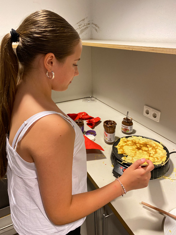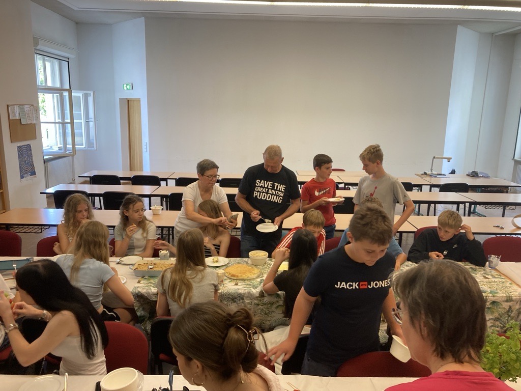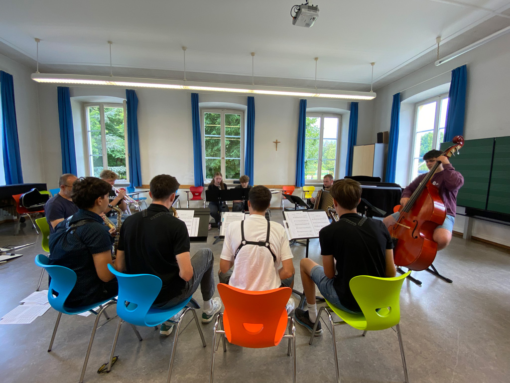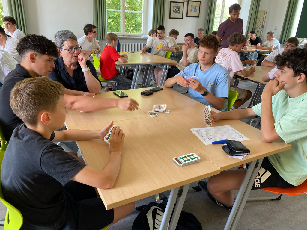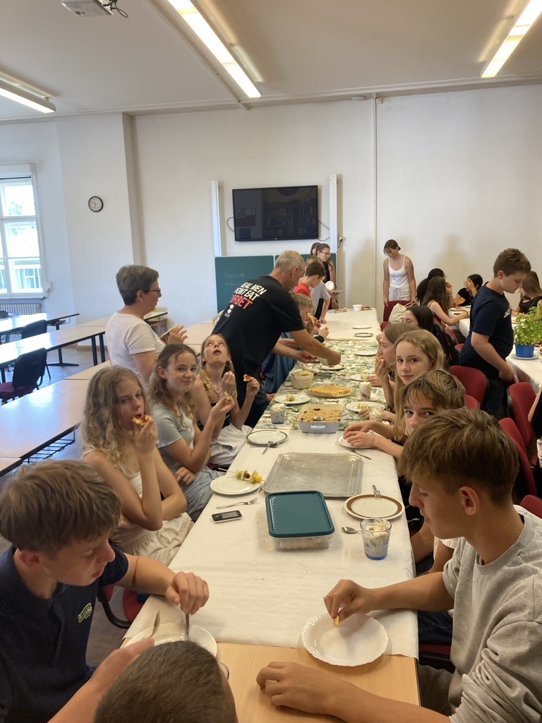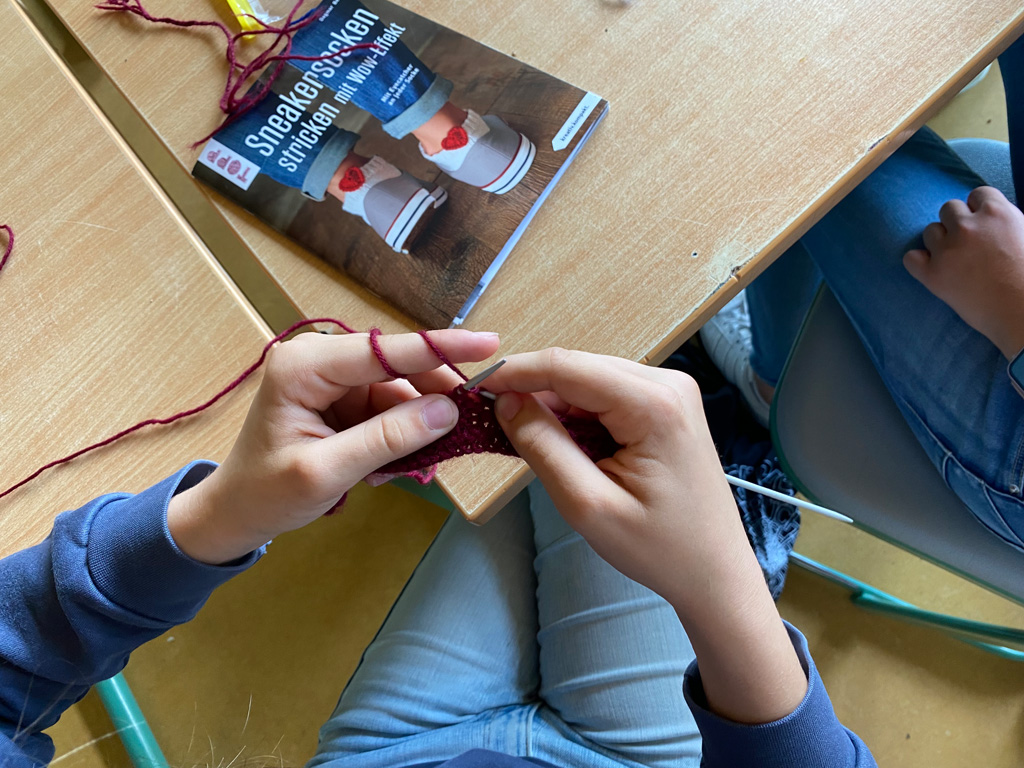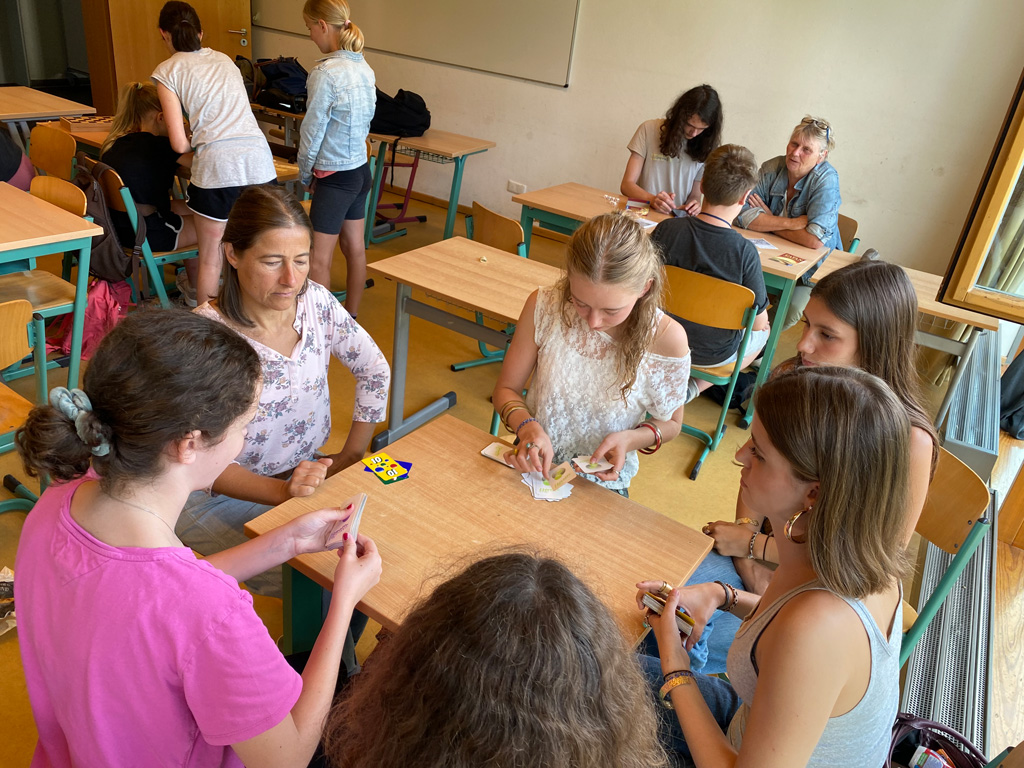 Hingegen nutzten sportliche Pragmatiker den Tag, um eine Schiedsrichter-Ausbildung fortzuführen, die sich im Ganzen über drei Tage hinzog. Auch Spiele aller Art standen hoch im Kurs: traditionelle Gesellschafts- und Brettspiele, das Boule-Spiel im Freien und ein Schafkopf-Turnier, bei dem auch Anfänger willkommen waren und Tipps von erfahrenen Spielern bekamen. Kreativ werden konnte man beim Stricken, beim Zeichnen, beim Kochen und Backen, beim Poetry Slam, beim Fotografieren und beim Songwriting. Eine kleine Instrumentalgruppe traf sich mit Christoph Rose zum Volksmusik-Spielen, ohne Klavier und Schlagzeug. Schülerinnen und Schüler des P-Seminars „Leseförderung“ von Frau Kraft führten ein kombiniertes Lese- und Bastel-Projekt mit Fünftklässlern durch und testeten dabei ihre didaktischen Fähigkeiten. Neben dem Körper konnte man an diesem Tag auch seinen Geist schulen bei Einblicken in die Wurzeln der griechischen Philosophie mit Herrn Prötzel. Kurzum: Es war für jeden etwas dabei!
