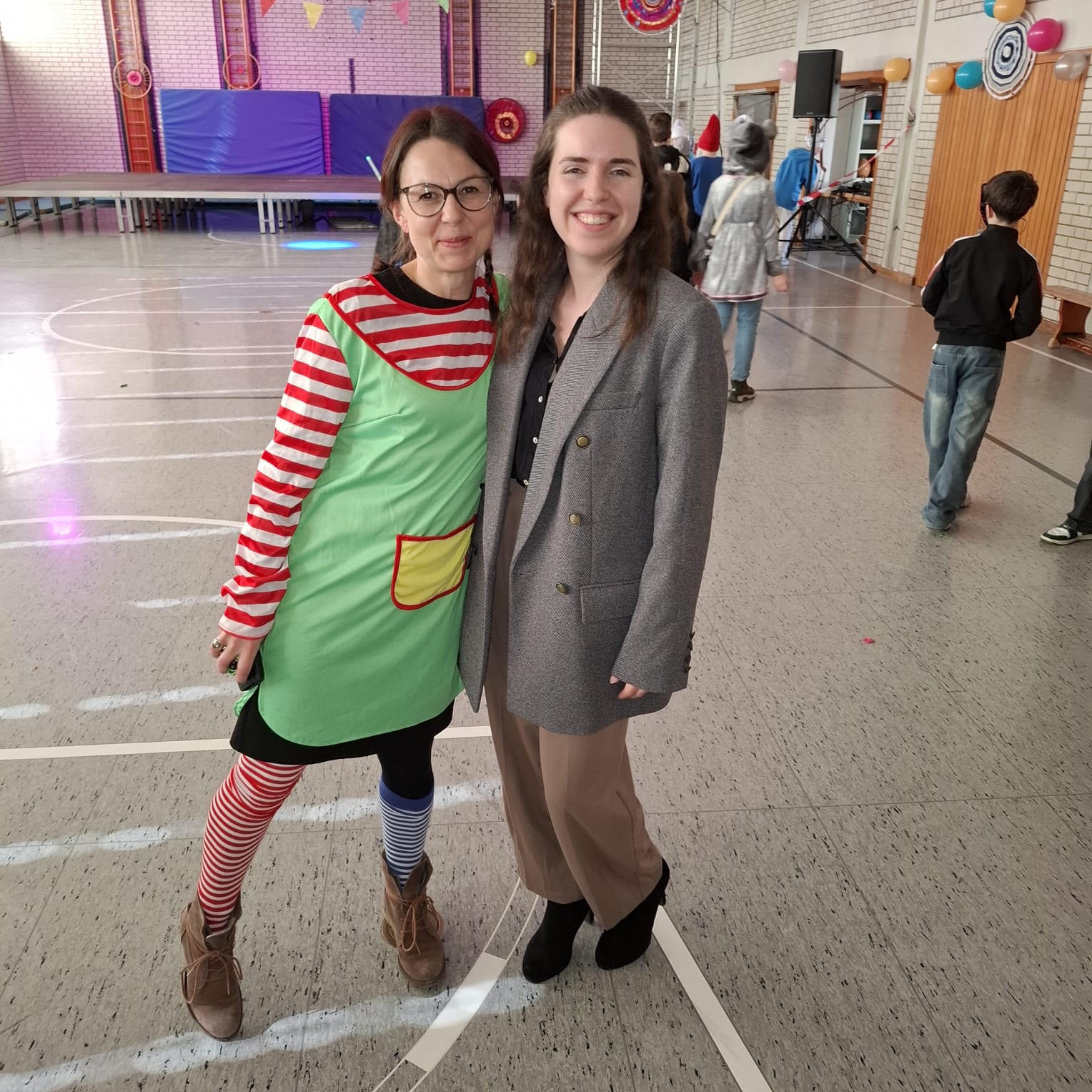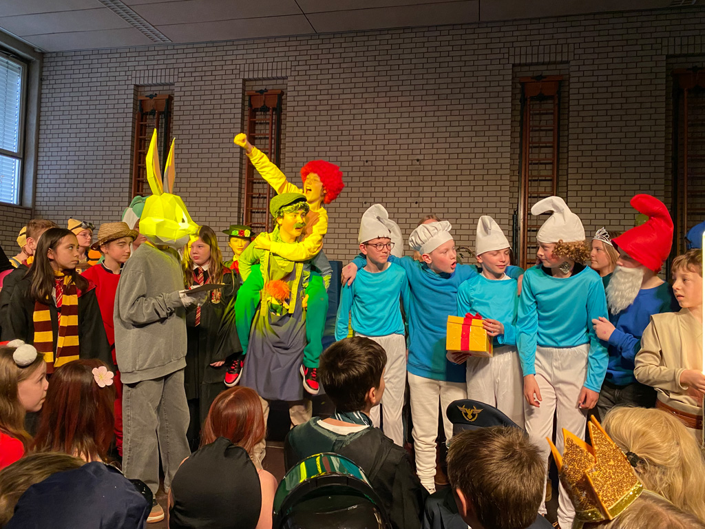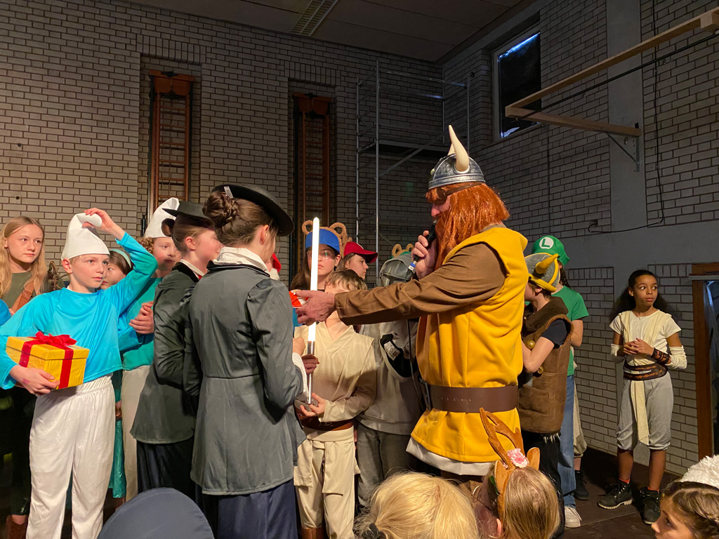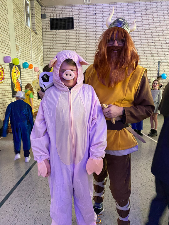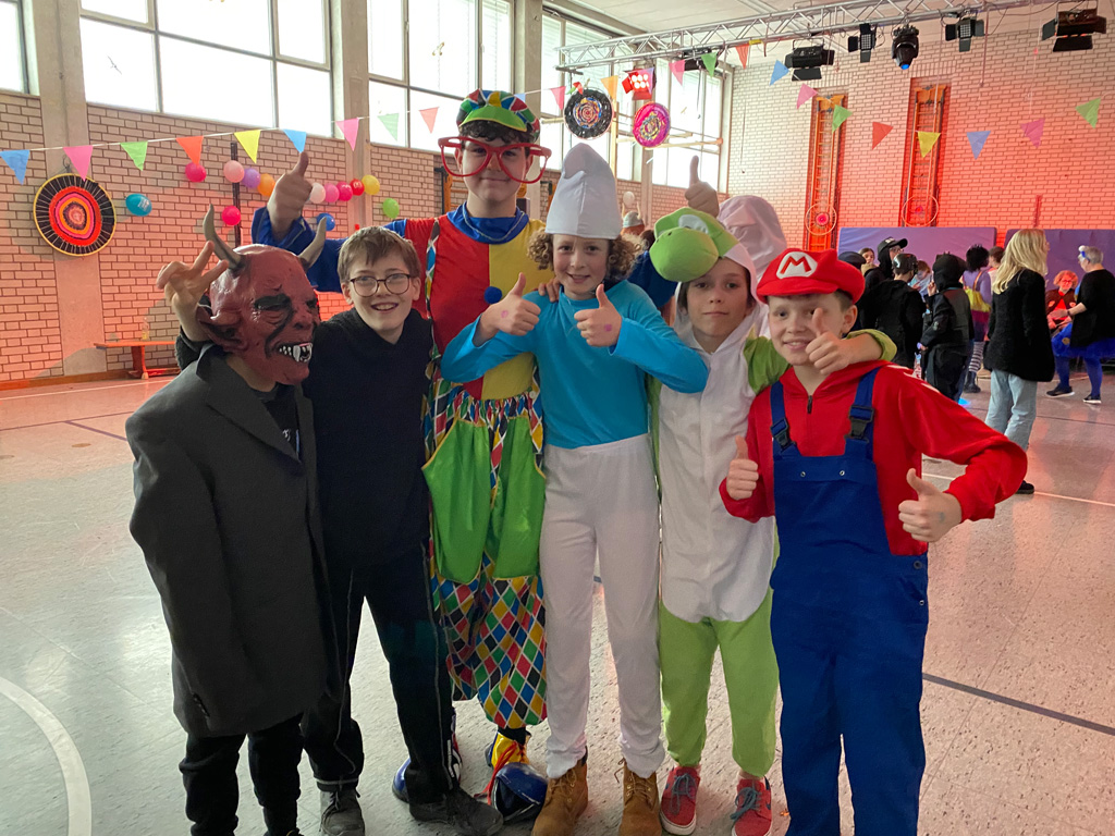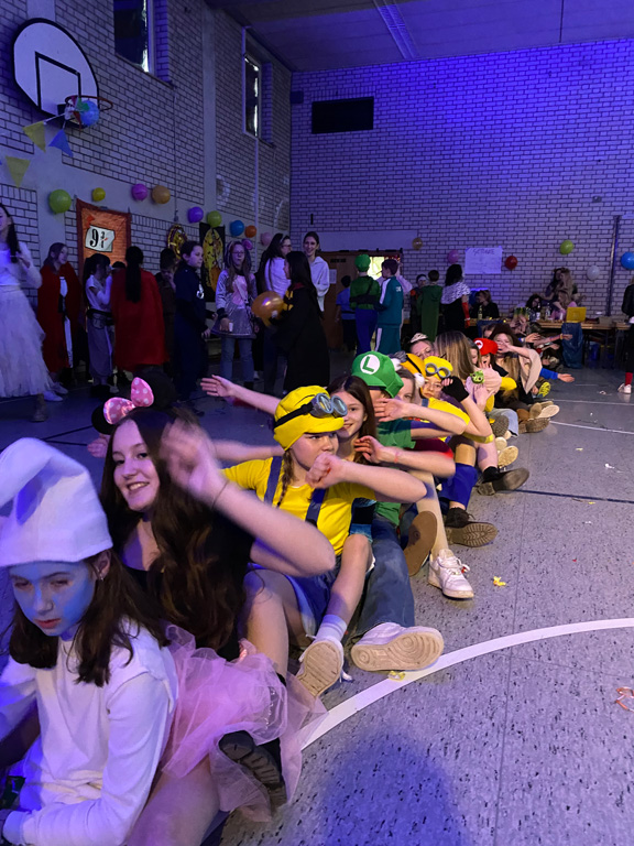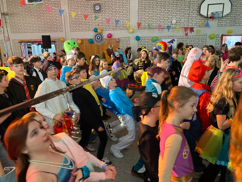 Mit dem Unterstufenfasching am Nachmittag des Unsinnigen Donnerstag erreichte die fünfte Jahreszeit am Auersperg-Gymnasium ihren Höhepunkt. Christian Schöttner alias Halvar (im Bild re.), pädagogischer Unterstufenbetreuer, richtet ihn seit 28 Jahren für die jüngsten Freudenhainer und eine Klasse der Don-Bosco-Schule aus, fleißig unterstützt von den Tutoren der 10. Klasse und vielen Schülerinnen und Schülern der 11. Klasse. Sie hatten die alte Turnhalle dekoriert, für den richtigen Sound und die richtige Musik gesorgt, ein Büffet mit süßen und sauren Leckereien aufgebaut und gestalteten das abwechslungsreiche Programm mit allem, was dazugehört: Limbotanz, Macarena, Polonaise, Schaumkussessen, Bonbonregen, Tombola, Fotobox und Maskenprämierung. Gemäß dem Motto „Kinderfilm und Kinderserie“ hatten viele der närrischen Besucher – darunter auch so manche Lehrerinnen und Lehrer - die Gestalt ihrer Lieblingshelden angenommen: Bugs Bunny, Meister Eder und sein Pumuckl, Mary Poppins, Prinzessin Leia, Super Mario. Es gab schier eine Invasion ganzer Gruppen von Schlümpfen, Minions und Star Wars-Figuren, die bereits vormittags verkleidet im Unterricht saßen und nachmittags ausgelassen feierten.